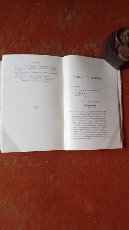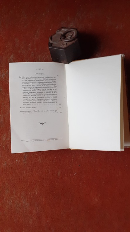 "Le Moul-es-Sâa : le sauveur qu'attendent tous les musulmans. Le peuple arabe. Mentalités et moeurs arabes; étude peu sympathique. La propriété indigène. La question foncière de 1830 à 1863. Le senatus-consulte. Histoire de la délimitation d'une tribu. La colonisation officielle. Conclusions : contraste entre l'Algérie arabe et l'Algérie française; soyons des bienfaiteurs des indigènes, mais surtout dans l'intérêt de la France; paix aux indigènes de bonne volonté; guerre aux fauteurs de désordre" (Tailliart, 2919)
