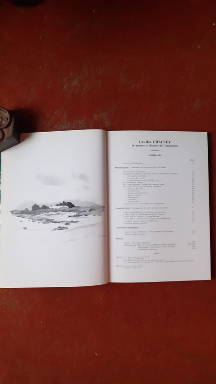 Imprimerie Le Cornec, Vire, 1997, in-4 br. (21 x 29,5), 119 p.,2ème édition, préface de René Lepelley, illustrations de Jean-Loup Eve, photographies de Gilbert Hurel, plan, carte, fac-similés, en annexe une grande carte dépliante volante de Chausey regroupant les toponymes connus (plan levé en 1831 par les ingénieurs hydrographes de la Marine), très bon état.