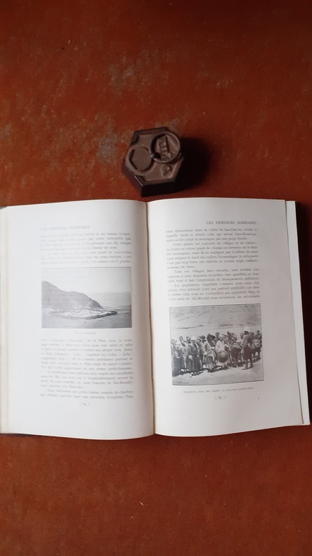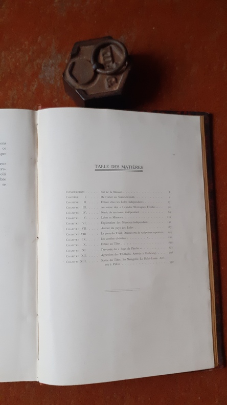 Un volume in-4° (21 x29 cm), reliure percaline éditeur de couleur vert amande avec titre et nom de l’auteur en lettres dorées sur le dos (lisse) et sur le 1er plat. Bords biseautés, tranche supérieure dorée.Précisons d’abord que le but du Commandant d’Ollonne était de réussir à parcourir les confins occidentaux de la chine en étudiant les populations mal soumises ou indépendantes qui les habitent: ce en quoi son expédition fut un succés.Introduction: I-VI, But de la Mission (une mission scientifique chargée d’étudier les minorités chinoises et non chinoises). Chapitre 1: De Hanoï au Sseut-tch’ouan (pp.1-27). Chapitre 2: Entrée chez les Lolos indépendants (pp28-50). Chapitre 3: Au coeur des grandes montagnes froides (pp.51-83. Chapitre 4: Sortie du territoire indépendant (pp..84-118). Chapitre 5: Lolos et Miaotseu (pp. 119-141). Chapitre 6: Exploration des Miaotseu indépendants (pp.142-166). Chapitre 7: Autour du pays des Lolos (pp.167-194). Chapitre 8: La porte du Tibet. Découverte de sculputres rupestres (pp.195-219). Chapitre 9: Les Confins tibetains (pp.220-248). Chapitre 10: Entrée au Tibet (pp.249-276). Chapitre 11: Traversée du “Pays de l’herbe” (pp.277-297). Chapitre 12: Agression des Tibétains. Arrivée à Lhabrang (pp;298-329). Chapitre 13 : Sortie du Tibet. En Mongolie. Le Dalaï-Lama. Arrivée à Pékin (pp.330-371).L’ouvrage contient aussi, comme il est dit dans le titre, 146 illustrations (en noir) ainsi que 4 cartes (in fine): -1: Carte générale de la Mission d’OLLONE. -2: L’Itinéraire au Yun-nan, Kouei-Tcheou & Sseu -Tchouan. -3: Pays des Miao-Tseu indépendants, par le Lieutenant de Fleurelle. -4: Itinéraire dans le Tibet Nord-Ouest, croquis provisoire par le Lieutenant de Fleurelle, 1908. Exemplaire en TRES BON ETAT.