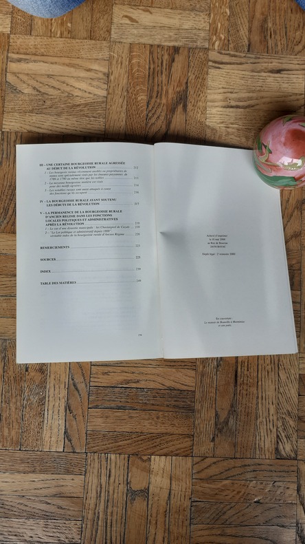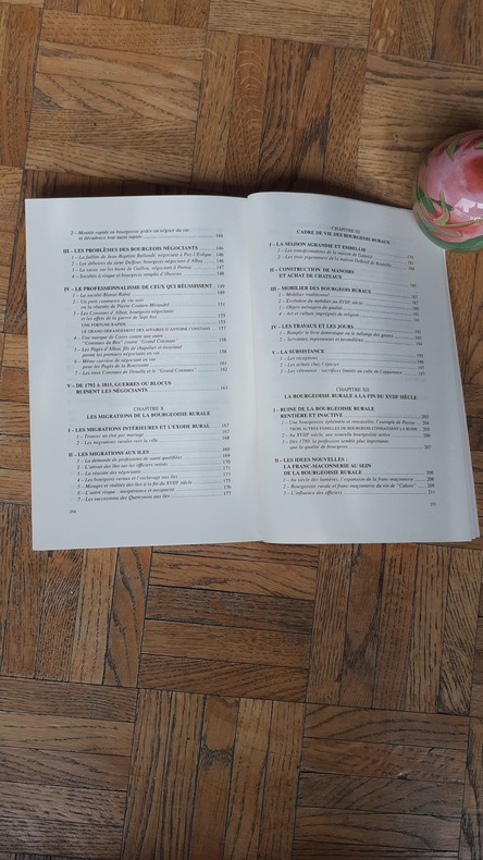 "L'histoire de la bourgeoisie des campagnes et des bourgs quercynois par Françoise Auricoste fait découvrir, aux XVIIe et XVIIIe siècles, un monde très vivant et permet d'imaginer la vie d'autrefois dans ces belles maisons de villages qui existent encore, que des familles ont occupées durant des générations. Fils de marchands enrichis par la ferme des rentes, propriétaires fonciers ne travaillant pas de leurs mains, les bourgeois ruraux, surveillant leur métairie se préoccupent avant tout de leurs terres et de leurs troupeaux d'où les conflits souvent pittoresques avec leurs voisins. Mais en vivant uniquement de leurs rentes, ils s'appauvrissent au XVIIIe siècle, aussi une tolérance, jamais dite, leur permet de rester bourgeois tout en pratiquant un métier, fut-ce celui de cabaretier. Grâce aux fonds privés déposés aux Archives départementales, aux correspondances, aux registres notariaux, les efforts d'éducation, d'instruction, le sort des cadets, des orphelins sont illustrés par des histoires vraies. Ce livre aborde la fréquentation de l'Université par la bourgeoisie rurale, l'influence des étonnantes dynasties médicales ou notariales villageoises. Un monde peu connu s'entrouvre, celui des officiers issus de la bourgeoisie rurale qui servent le Roi avec fierté mais ne dépassent pas le grade de capitaine. Cependant une bourgeoisie entreprenante apparaît en Quercy au XVIIIe siècle, tels les planteurs de pins de Bouriane ou les éleveurs de bêtes de boucherie en Ségala et bien sûr, les négociants en vin de la vallée du ""Caors"". La montée en bourgeoisie des négociants en vin est parsemée de succès et de difficultés liées aux privilèges de Bordeaux et aux guerres navales. Les négociants et les cadets de familles font le voyage aux Iles pour y commercer ou s'y établir. Les notaires, les correspondances, livrent le récit de leurs aventures et les causes de leurs succès ou de leurs échecs. Le cadre de vie de la bourgeoisie rurale, maison, manoir, mobilier et vie quotidienne n'est pas oublié ni les idées nouvelles. Voir le sommaire sur photos jointes"