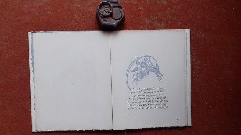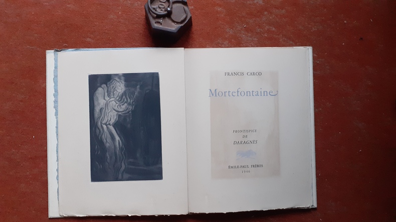 Emile-Paul Frères, 1946, in-4 en cahiers (22 x 28) sous chemise souple bleutée avec petite vignette illustrée, 23 p., 1ère édition, tirage à 350 exemplaires numérotés, celui-ci N° 321/330 sur vélin blanc de Lana (après les 20 sur Vidalon), dédié à Henri Martineau, frontispice de Jean-Gabriel Daragnès, sous chemise cartonnée (dos passé), et étui comportant des traces de mouillure, ouvrage lui-même frais en bonne condition, ex-dono, bon état.