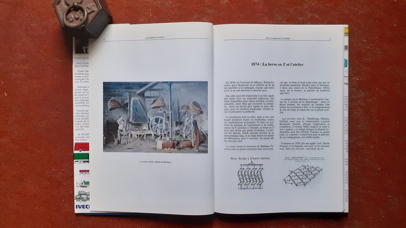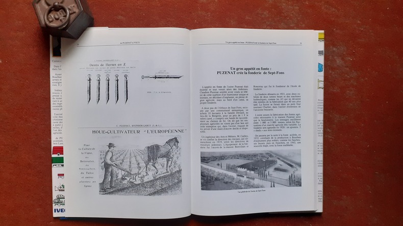A la fin du XIXe siècle, un astucieux serrurier et mécanicien de Bourbon-Lancy, Emile Puzenat, met au point une herse en zigzag qui révolutionne l'outillage agricole. Au concours de Mâcon de 1874, il gagne le premier prix pour son invention, puis le premier grand prix en 1878 au concours de Paris organisé à l'occasion de l'Exposition universelle. Son ingéniosité ne s’arrête pas à ce succès, il améliore et invente de nombreux produits : râteaux à cheval, charrues, faneuses, extirpateurs et houes. En 1900, Emile Puzenat fait construire une vaste usine qui existe encore dans le quartier Saint-Denis à Bourbon-Lancy et plus tard, des cités ouvrières pour loger les nombreux ouvriers. Après la Première guerre mondiale, dans le contexte de reconstruction de l’économie agricole, l’entreprise prend son essor. En 1924, elle emploie 1000 ouvriers et atteint un record de 148 789 matériels produits. En 1958, Puzenat et Fiat fusionnent sous le nom de Fiat-Someca afin de construire des tracteurs. Dans les années 1990, la marque Iveco continue à faire fonctionner les usines de Bourbon-Lancy afin de produire des moteurs pour camions, bus et engins agricoles. Une bonne étude solidement documentée sur une formidable aventure industrielle. Voir le sommaire sur photos jointes.