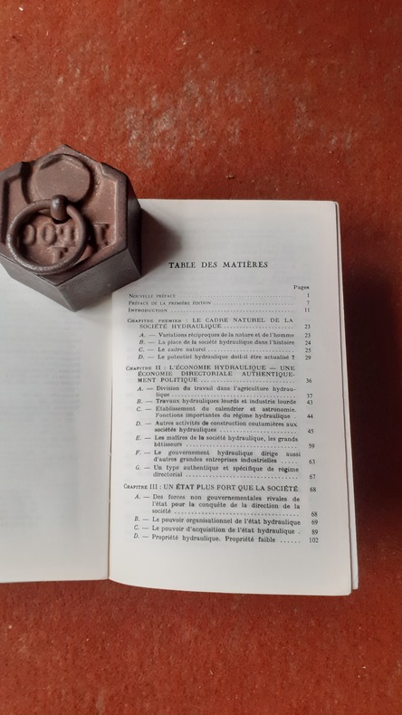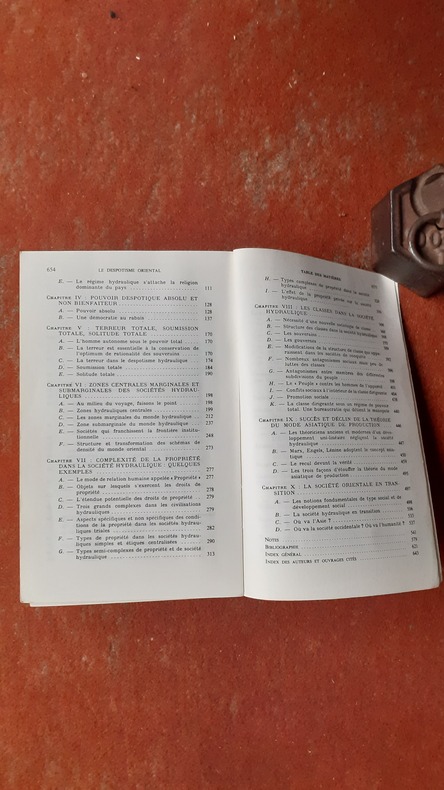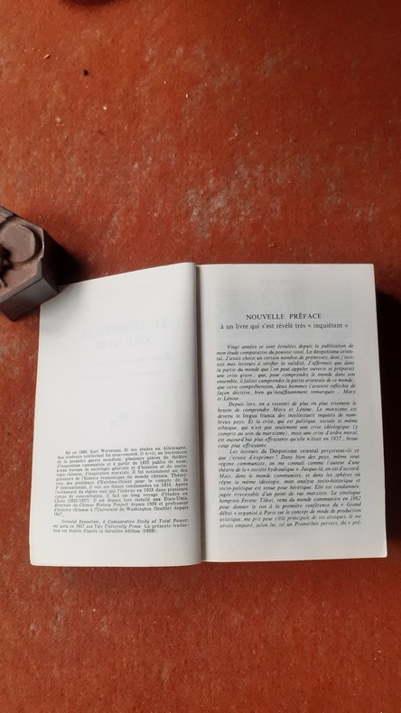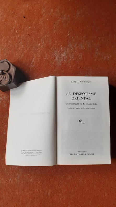 A-t-il existé et existe-t-il une forme sociale particulière à laquelle on puisse donner le nom de "société asiatique" ou de "despotisme oriental", quitte à englober dans ce singulier "Orient" le Pérou Inca ou les Chaggas d'Afrique ? Après bien d'autres, Karl Wittfogel répond par l'affirmative, mais avec une volonté systématisante et une documentation d'une ampleur jusque-là inégalée. Aboutissement d'une recherche et d'une polémique qui dure depuis plusieurs décennies, "Oriental Despotism" est un livre qui provoque le lecteur et ne peut pas ne pas susciter la discussion . Si nuancée et développée que soit la pensée de l'auteur, les lignes générales en sont simples et claires , à condition d'avoir présents à l'esprit les cadres généraux de la théorie marxiste à laquelle K. Wittfogel doit l'essentiel de sa formation. Il existe un certain nombre de sociétés — telles celles de l’Égypte pharaonique ou de la Chine impériale — dans lesquelles la classe dirigeante ne se définit pas par la place qu'elle occupe dans les rapports de production, mais par son rôle d'appareil d'État bénéficiant du surplus du travail paysan. La formation de telles couches sociales s'explique historiquement par la "réponse", dans certaines conditions bien définies, aux problèmes que pose l'organisation des grands travaux, et singulièrement des travaux d'irrigation et de drainage, dans les vallées inondées ou inondables des pays semi-arides. K. Wittfogel appelle hydroagriculture et parfois agriculture lourde ce type d'activité humaine qui réclame des hommes plutôt que des techniciens, des conducteurs d'hommes plutôt que des ingénieurs. Le Grand Canal de Chine aussi bien que les pyramides d’Égypte sont l'œuvre de foules. Voir le sommaire sur photos jointes.
