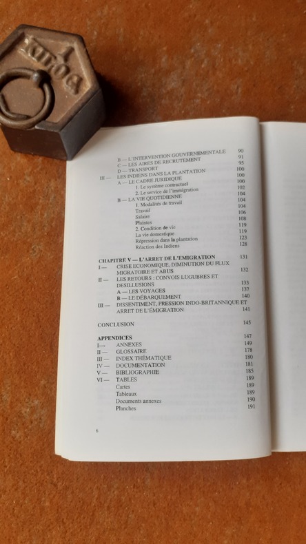 De concert avec les autorités anglaises, l'administration française draine au cours du XIXe siècle plus d'une centaine de milliers d'engagés indiens en direction de la Réunion : l'île à sucre. Issus de part et d'autre de la péninsule indienne, quelles motivations poussent les coolies à s'expatrier vers des lieux inconnus et selon quelles modalités de recrutement et de transport ce déplacement de main-d'oeuvre s'est-il effectué ? L’engagisme est la forme de travail qui remplace l’esclavage dans les colonies esclavagistes où l’organisation de la production repose sur un nombre élevé d’esclaves. Il s’agit d’un "travail contraint" même si les travailleurs sont juridiquement libres. Voir le sommaire sur photos jointes.