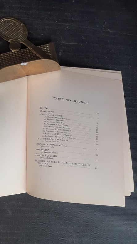 "Ce livre est l'histoire de la vie des médecins de la Tunisie deouis cinquante ans. Il rapporte leur œuvre. Très simplement il conte ce que furent, au début de ce siècle, les hommes qui, parfois à dos d'âne, allaient porter dans les villages les plus éloignés ou dans les gourbis les plus isolés le remède apaisant et la parole consolante. Il dit leur action. Il témoigne aussi de l'évolution que s'est faite" (R. Dana). Voir le sommaire sur photos jointes.