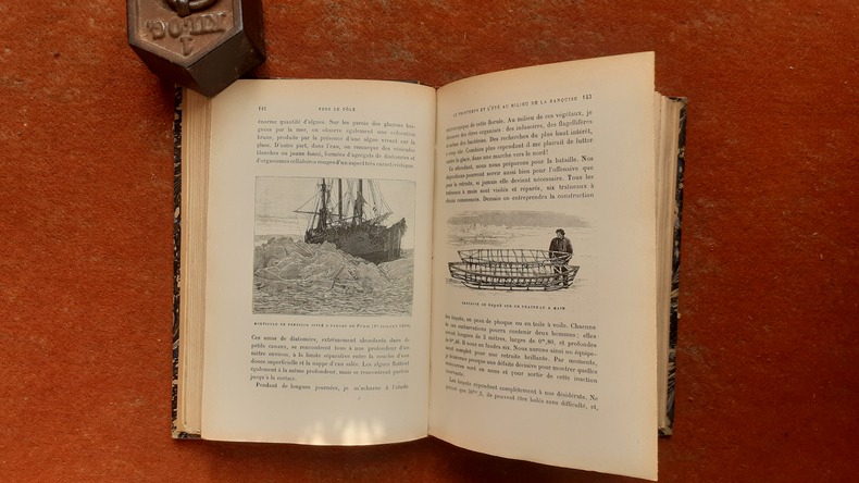 Paris E. Flammarion 1897 -in-8 demi-chagrin à coins un volume, reliure demi-chagrin violet à écailles in-octavo à coins cartonnage Editeur (binding half shagreen in-octavo Editor with corners)(23 x 16 cm), dos long (spine without raised bands), décoré or (gilt decoration) dos titré "or"d'une plaque spéciale Editeur, premier plat titré "or" et orné d'un personnage doré dans la banquise (plaque spéciale Editeur), roulette chainette "or" aux mors et aux coins, tête lisse dorée, gouttière et tranche de queue non-rognées, orné de 200 illustrations in et hors-texte en noir, 424 pages, sans date (1897) Paris E. Flammarion Editeur,