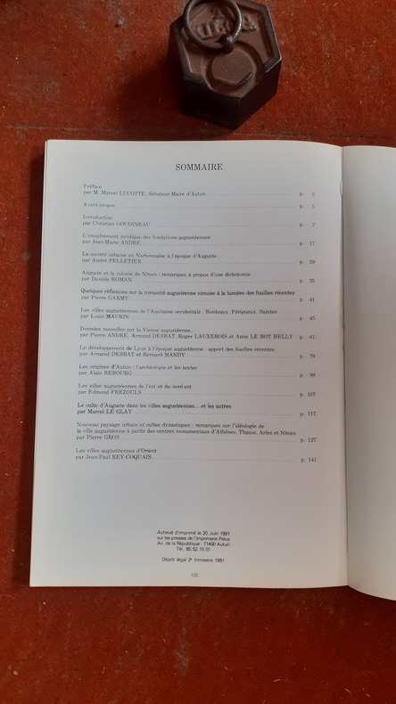 L'organisation par Auguste de la Gaule Chevelue fait l'objet de ce riche colloque. Les célébrations du bimillénaire d'Autun ont constitué une occasion de choix pour réunir différents spécialistes français sur le thème des villes dont de multiples aspects sont abordés, de la problématique générale, par C. Goudineau, et de l'encadrement juridique et institutionnel par J. M. André, au remodelage idéologique de l'urbanisme et du paysage monumental, par Pierre Gros, en passant par les réflexions sur les données archéologiques relatives à Nîmes, à Bordeaux, Périgueux, Saintes, Vienne, Autun notamment. Voir le sommaire sur photos jointes.