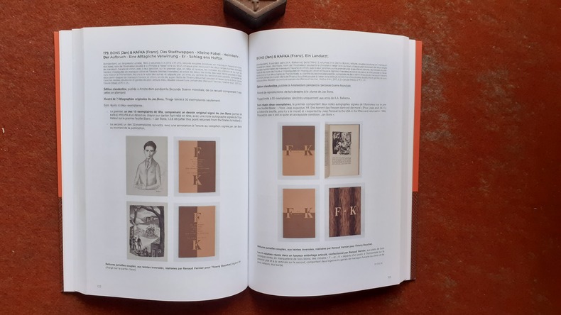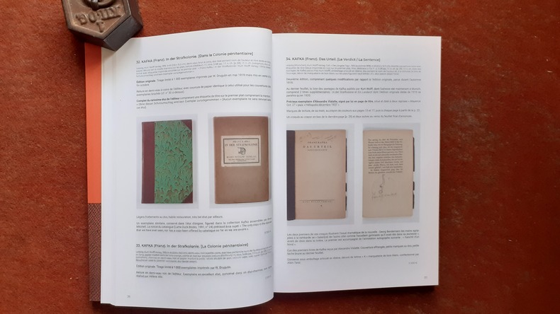"Catalogue de l'exceptionnelle collection consacrée à Franz Kafka constituée par Thierry Bouchet sur près de 40 ans. Y sont décrits, par ordre chronologique, 427 livres, manuscrits, lettres et documents. Cet ensemble comprend : - l'intégralité des éditions originales des livres de Franz Kafka publiées en allemand de son vivant et l'essentiel de ceux édités après sa mort, - de nombreuses pré-originales de récits de Kafka en allemand parues dans des journaux, revues, anthologies ou almanachs, - les archives d'Alexandre Vialatte (premier traducteur de Kafka en français) consacrées à son travail de traduction de l'auteur pragois, - des éditions originales en langue étrangère (tchèque, français, anglais, espagnol) ainsi que des pré-originales dans ces langues, - des livres illustrés et œuvres graphiques (gravures, dessins, lavis, collages et huiles) par des artistes internationaux inspirés par l'œuvre de Kafka, - d'autres documents en rapport avec Kafka (deux journaux consacrés au Congrès sioniste lui étant adressés en 1923, des livres à propos de Kafka, etc)."