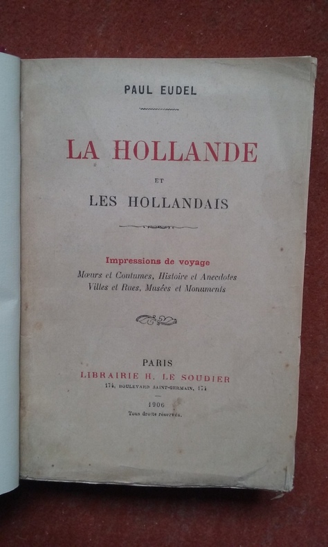 Intéressante relation de voyage sur la Hollande du début du XXe siècle. Fin observateur, curieux de tout, l'auteur donne beaucoup de détails sur ce qu'il a vu et entendu. La table, le livre et la société littéraire, le costume, les courses, la kermesse, les tulipes, le fromage, le patinage, la tolérance religieuse, caractère de la population, les musées... Le voyageur a visité : Le pont de Moerdijk - Le vieux Dordt - Rotterdam - 's Gravenhage - La Haye - Le Mauritshuis - Scheveningue - Delft - Amsterdam - Leyde - Marken - Harlem - Utrecht - Alkmaar - Zaandam - Hoorn - Enkhuizen - Zwolle - Kampen -Leeuwarden - Groningue... Table des noms cités, prononciation hollandaise.