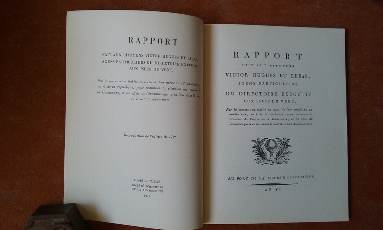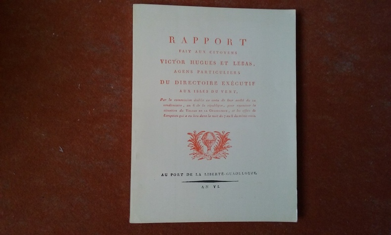 Ce rapport a été élaboré par la Commission établie en vertu de l'arrêté des citoyens Hugues et Lebas du 12 vendémiaire, an 6 de la République, pour examiner la situation du Volcan de la Guadeloupe et les effets de l'éruption qui a eu lieu dans la nuit du 7 au 8 du même mois. Le principal rédacteur était Thomas-Luc-Augustin Hapel-Lachénaie qui a annoté ce rapport dont la reproduction en fac-similé a été faite d'après l'exemplaire de la Bibliothèque municipale de Bordeaux. Ces annotations manuscrites, compte tenu de leur intérêt, ont été conservées.