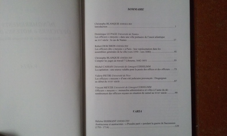 Les officiers "moyens" sont ceux qui ne servent ni dans une cour souveraine, ni dans les plus médiocres juridictions. L'objectif de ce tome 3 vise à dénombrer les officiers "moyens", ce qu'ils représentent dans une ville et comment leur nombre évolue-t-il. Voir le sommaire des contributions sur photos jointes.
