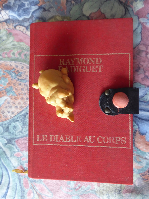 Ce roman, en grande partie autobiographique, fit scandale, tant pour l’atteinte à la mémoire quasi-sacrée des Poilus qu’au caractère indécent de cette liaison à peine déguisée- entre un adolescent de quatorze ans, et une jeune femme, fiancée et majeure. Scandale, cynisme et jeunesse de l’auteur qui eut l’heur -ou le malheur- de disparaître quelques mois après la sortie de son livre furent les ingrédients d’un succès assuré : plus de cent mille exemplaires vendus dans l’année. NOTE SUR LA RELIURE : la reliure d’origine a été revue et corrigée : un « amateur » a ajouté un fermoir de cuir noir, avec rivet rose et pièce de cuir rivetée sur le plat supérieur ; mais il y a « pire » : sur ce même plat, « l’artiste », façon REISER, a collé une petite statuette en matière plastique rosâtre, montrant un couple de Suidés, certainement verrat et truie, eux-mêmes collés dans la position dite du Missionnaire. Quel gros dégueulasse, l’artiste ! Cependant, au second degré, l’alliance entre ce fermoir façon Missel et cette scène Indoue suggèrent plutôt, une belle allégorie sur le culte d’Eros… Qui vivra verra… Sympathique exemplaire à ranger sur le second rayon , hors de portée des (très petits) enfants. SAL(D2)
