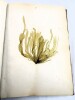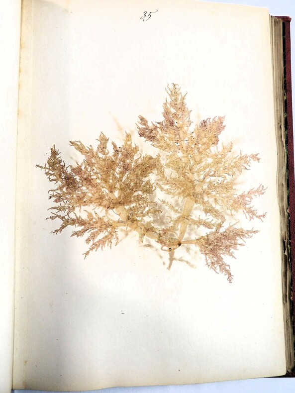 Sans lieu, sans éditeur (manuscrit - pièce unique), sans date (circa 1870). In-8 - 18 x 25 cm. Reliure de l'époque en demi-chagrin rouge, dos à 4 nerfs, orné de caissons et petits fers dorés, titre doré "Algues marine" sur le dos. 85 planches. Alguier extrêmement soigné, composé à la fin du 19e siècle (vers 1870), recueillant 83 spécimens d'algues pressés sur 85 feuillets de papier fort. Planches montées sur onglet. Spécimens non-identifiés (non légendés), en excellent état de conservation. À la fin du XIXe siècle, la collecte et la conservation d'échantillons d'algues sont devenues un passe-temps populaire pour les Européens aisés. Ces collectionneurs passaient de nombreuses heures à sécher, presser et monter avec soin les spécimens qu'ils trouvaient au cours de leurs voyages. Leurs recueils illustrent ce phénomène de mode, mais présentent également, encore aujourd’hui, un intérêt scientifique, par exemple en permettant de constater si certaines variétés ont disparu.