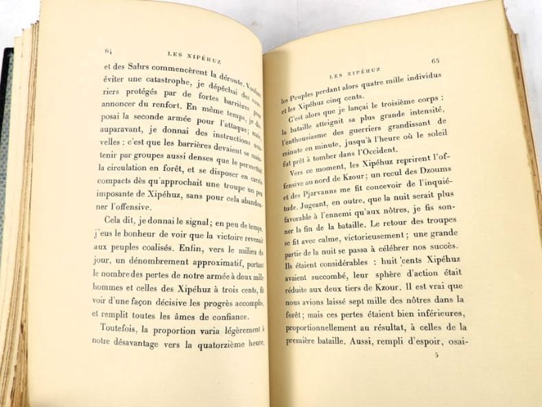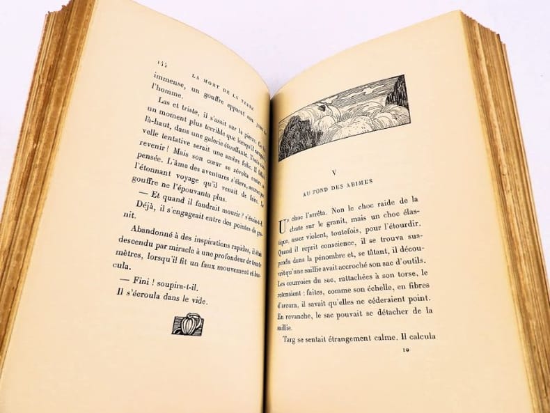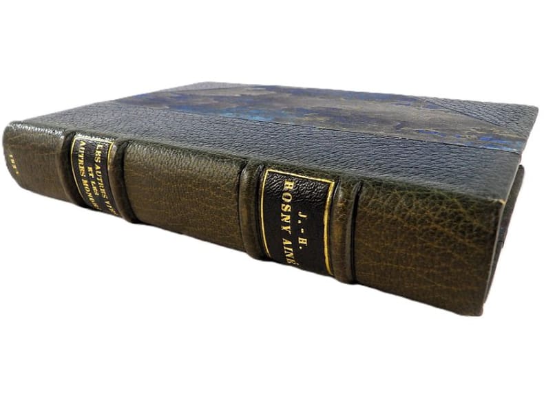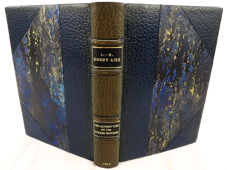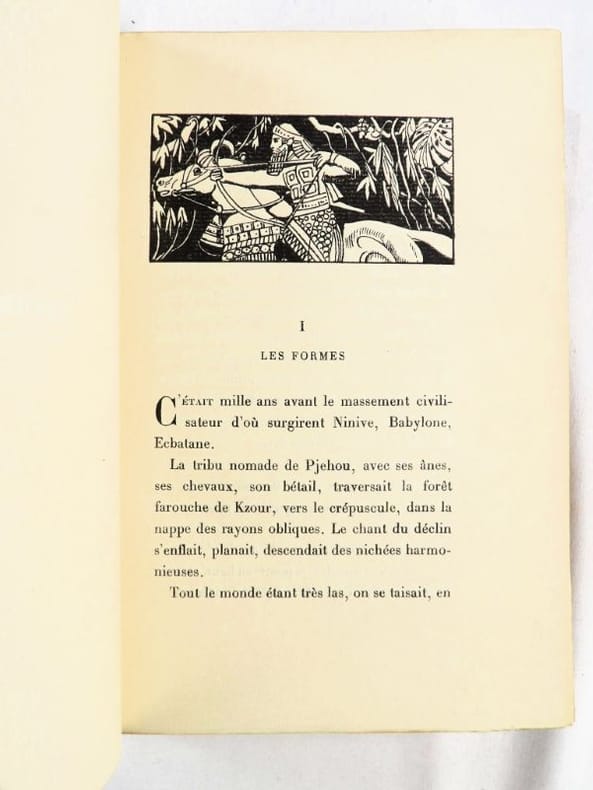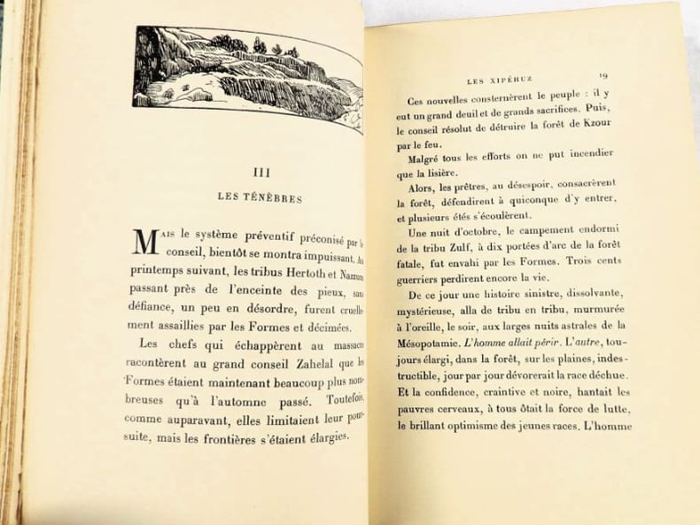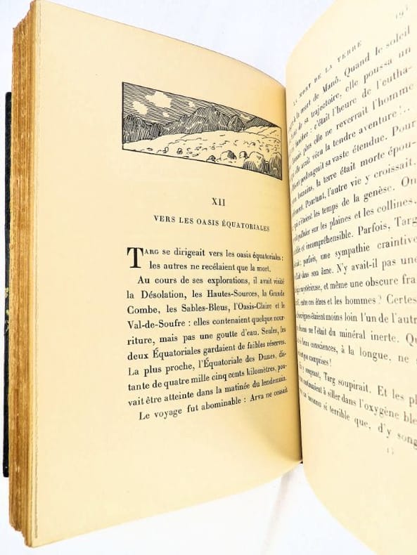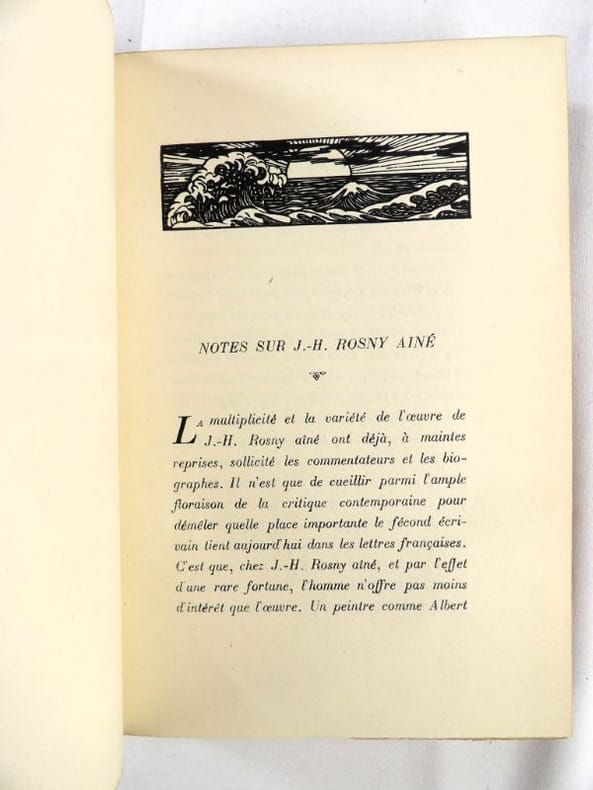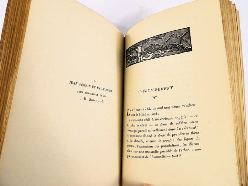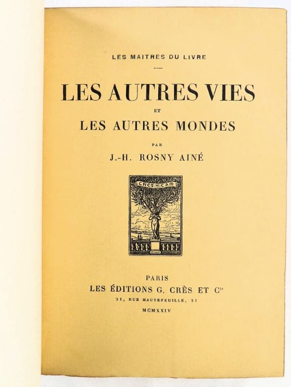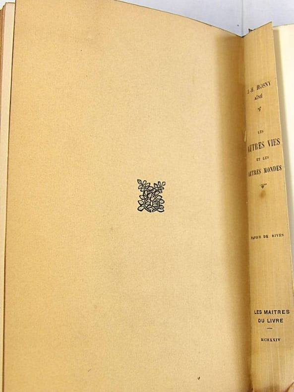 Crès "Les maîtres du livre" 1924, in-8 broché, couverture rempliée, VII-337 p. (bel exemplaire non coupé) Tirage limité à 1955 exemplaires, 1 des 1850 numérotés sur vergé de Rives. Belle édition de ces trois récits de science-fiction du génial auteur de La Guerre du Feu, enrichie d'un portrait de l'auteur en frontispice et de bandeaux.