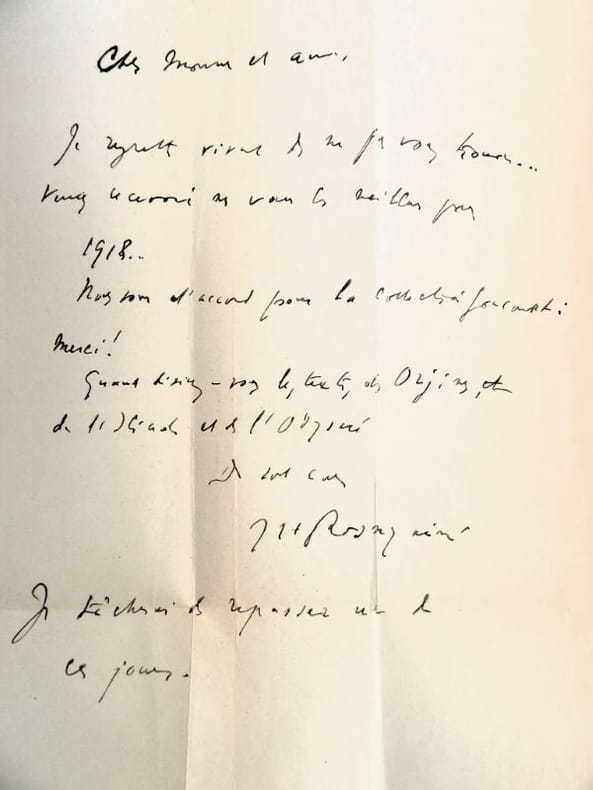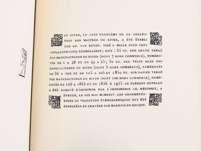 Paris, Crès et Cie, Les Maîtres du Livre, 1924. In-12 - 19,5 x 14 cm. Reliure en demi-maroquin bleu nuit à coins, dos à 4 nerfs, pièces de titre en chagrin noir, date en queue, tête dorée, couvertures et dos conservés. Edition décorée de compositions originales de Maurice de Becque ainsi que d'un portrait de l'auteur gravé sur bois par P. Baudier. Exemplaire numéroté sur papier de Rives, enrichi d'une lettre autographe signée de l'auteur sur papier à en-tête des éditions Crès.