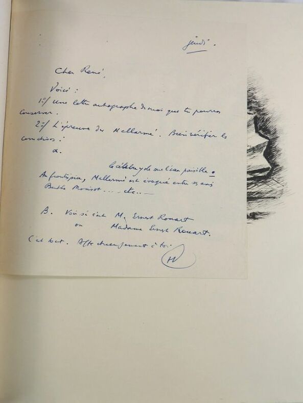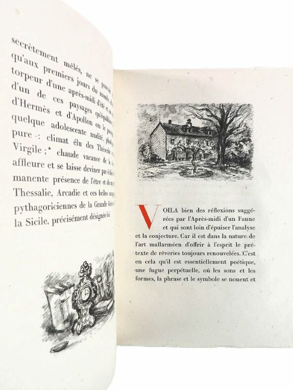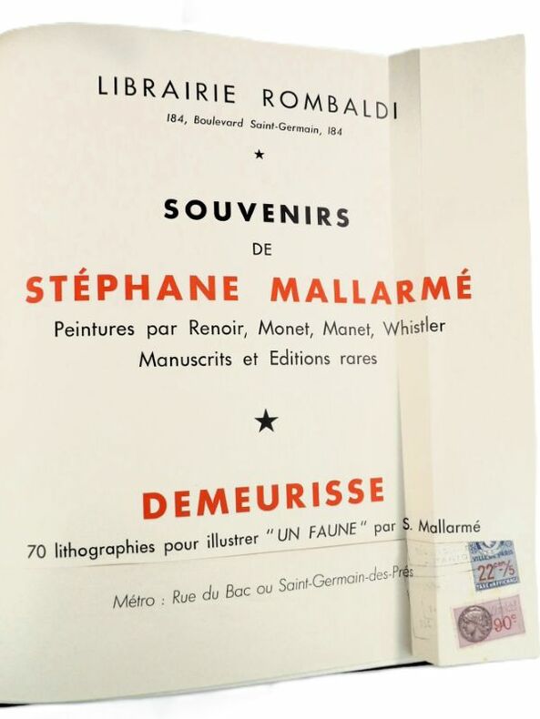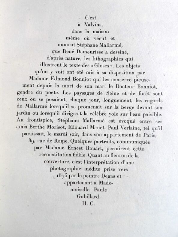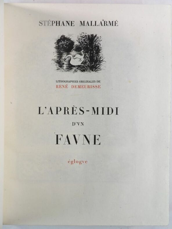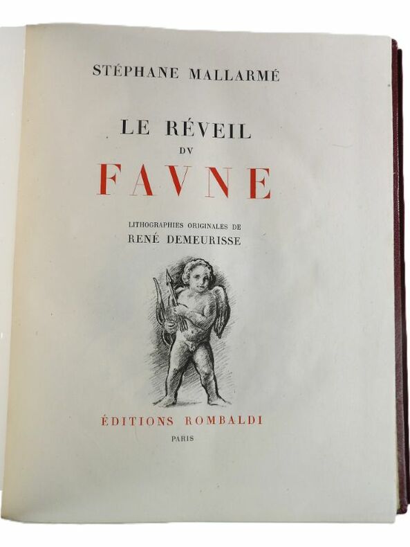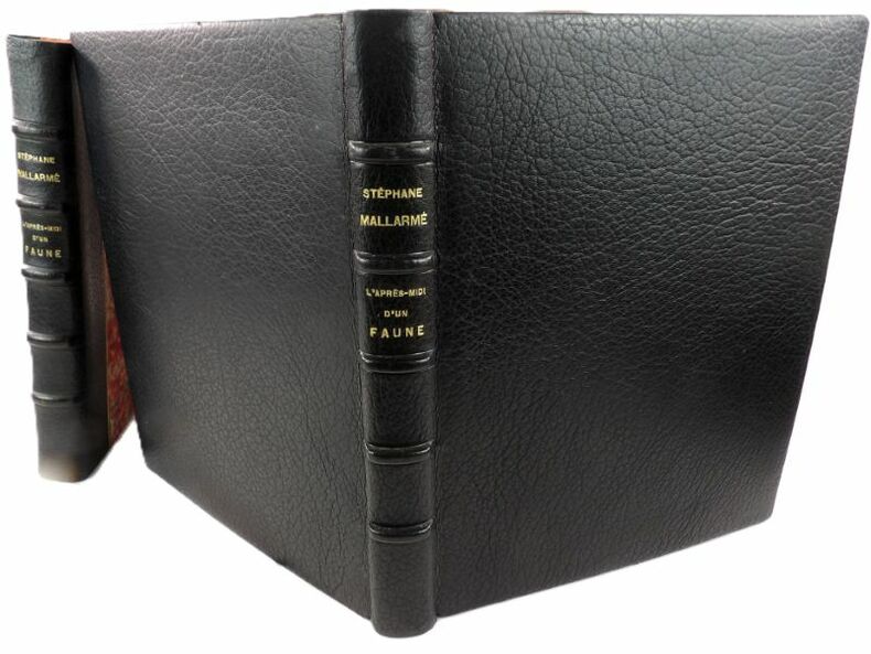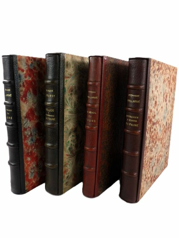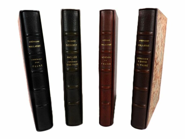 Paris, Rombaldi, 1943-1944. 4 Volumes, complet. In-folio - 33 x 26,5 cm. Reliures signées Legendre en plein maroquin (noir, sapin, bordeaux et brun), dos ornés de 5 nerfs, roulette dorée sur les coiffes, filet doré sur les coupes, quintuple filet doré en encadrement des contreplats, vélins incrustés au centre des contreplats, étui et chemise assortis. Edition en partie originale établie par Henry Charpentier d'après les manuscrits de Mallarmé, dont il était l'exécuteur testamentaire.Tirage limité à 140 exemplaires pour Le Réveil du Faune, celui-ci non numéroté, et à 220 exemplaires pour Gloses et Offrandes à divers du Faune, celui-ci exemplaire B, imprimé spécialement pour René Gas, qui dirigea cette publication. L'Après-Midi d'un faune est enrichi de 2 dessins originaux, le premier signé Demeurisse, le second non signé, et Prélude à l'Après-midi d'un Faune est également enrichi de 3 dessins originaux, tous signés et datés de 1943 par Demeurisse. Cet exemplaire exceptionnel comprend : 6 suites de 21 planches chacune pour L'Après-midi d'un Faune, 7 suites de 16 planches pour Prélude à l'Après-midi d'un faune, 3 suites de 21 planches pour Le Réveil du Faune et enfin, 6 suites de 19 planches pour Gloses et Offrandes à divers du Faune. Ce qui fait un total de 24 suites et de 415 planches.Pour parachever l'ensemble, le dernier volume, Gloses et Offrandes à divers du Faune contient une affiche d'annonce de parution des éditions Rombaldi in fine, ainsi qu'une lettre autographe signée d'Henry Charpentier à René Gas, lui indiquant qu'il pourra conserver cet autographe et qu'il lui confie l' "épreuve du Mallarmé", ce qui explique cet exemplaire hors normes.