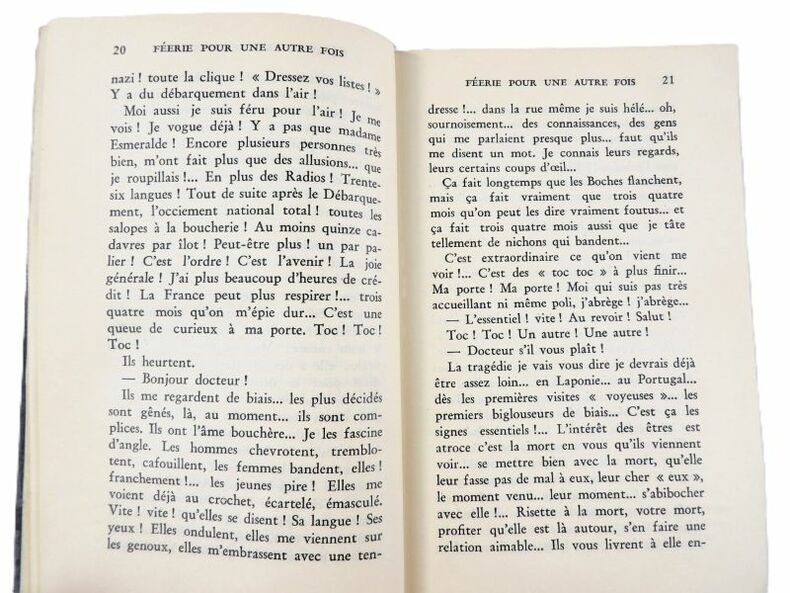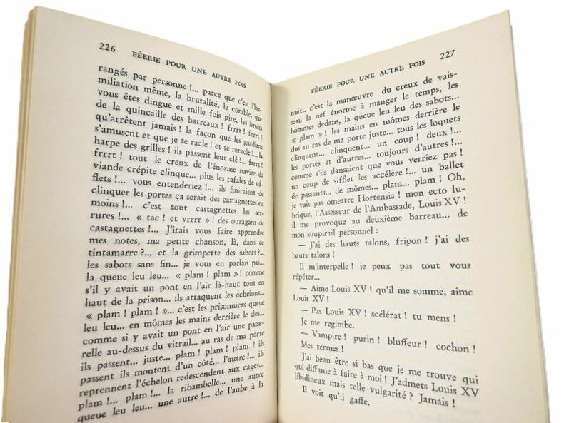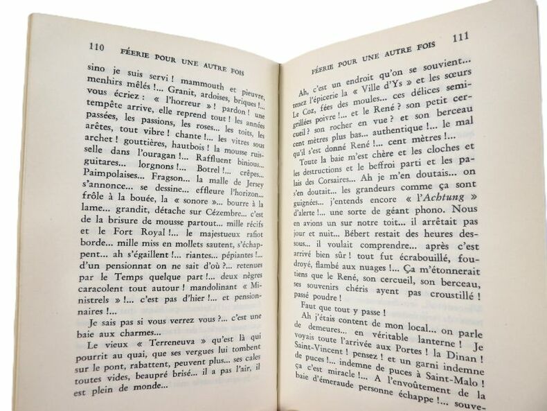 Editions Gallimard 1985. In-8 broché de 279 pages au format 20,5 x 14 cm. Couverture avec titre imprimé. Dos carré. Plats et intérieur frais malgré une petite trace d'étiquette en haut du 4ème plat. Edition de cette version primitive de " Féerie pour une autre fois ", établie et présentée par Henri Godard. Edition originale en superbe état général.
