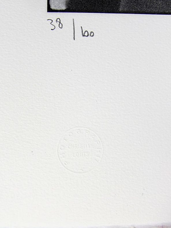 Sans lieu, sans mention d'éditeur, sans date (circa 1970-1995). 50 x 65 cm. Tirage photographique original sur papier d'Arches. Tirage limité à 100 exemplaires, numérotés et signés au crayon par le photographe. Tampon à sec "Photographie Christian Louis".