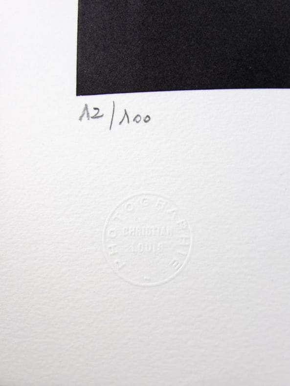Sans lieu, sans mention d'éditeur, sans date (circa 1970-1995). 50 x 65 cm. Tirage photographique original sur papier d'Arches. Tirage limité à 100 exemplaires, numérotés et signés au crayon par le photographe. Tampon à sec "Photographie Christian Louis".