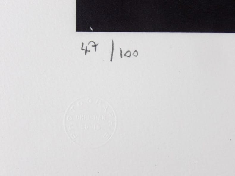 Sans lieu, sans mention d'éditeur, sans date (circa 1970-1995). 50 x 65 cm. Tirage photographique original sur papier d'Arches. Tirage limité à 100 exemplaires, numérotés et signés au crayon par le photographe. Tampon à sec "Photographie Christian Louis".