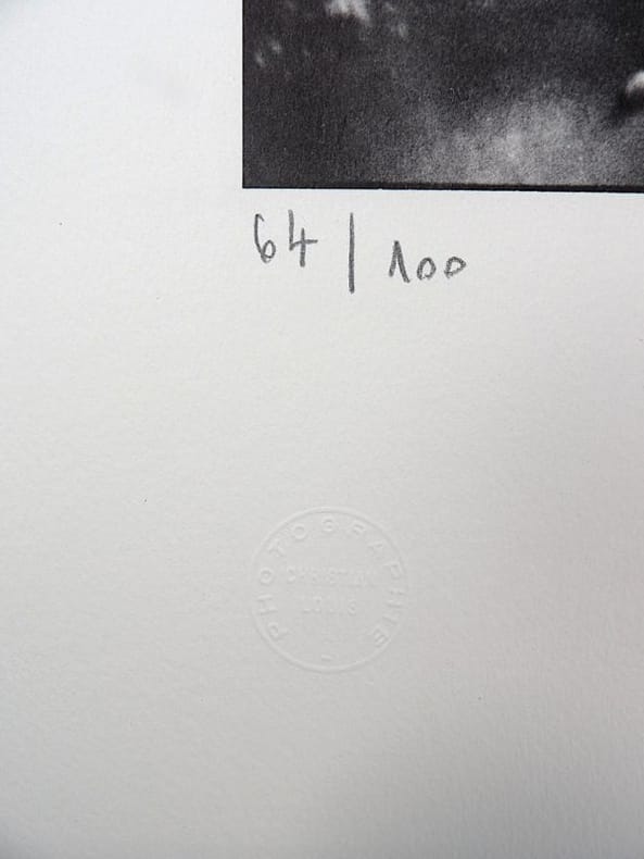 Sans lieu, sans mention d'éditeur, sans date (circa 1970-1995). 65 x 50 cm. Tirage photographique original sur papier d'Arches. Tirage limité à 100 exemplaires, numérotés et signés au crayon par le photographe. Tampon à sec "Photographie Christian Louis".