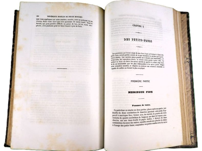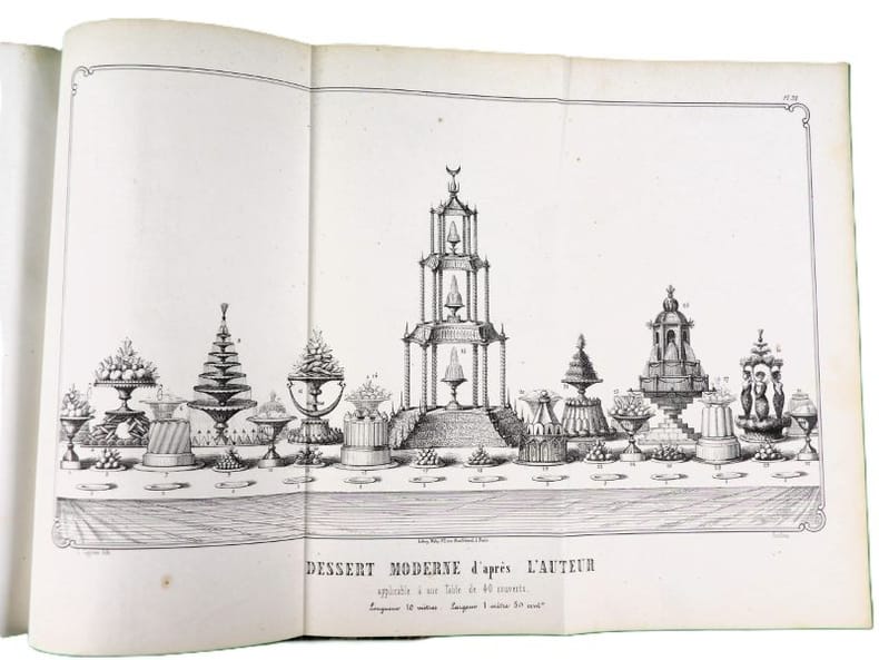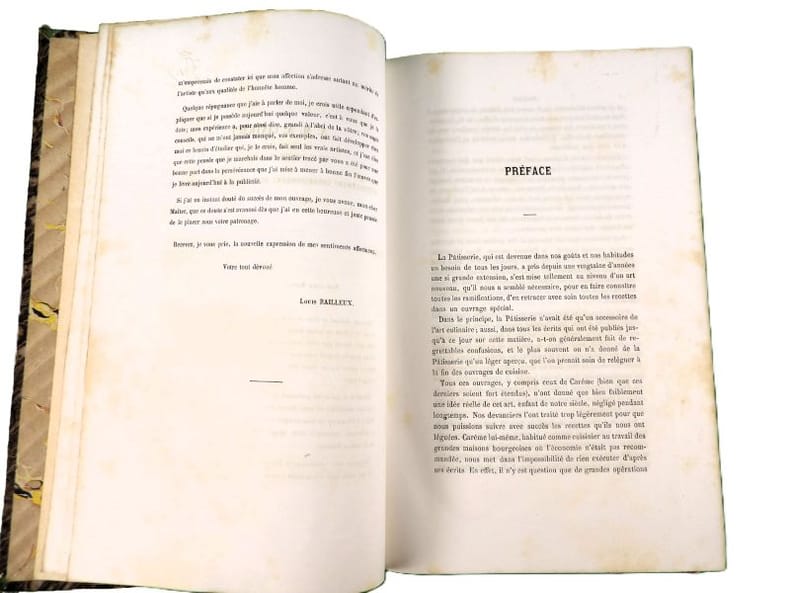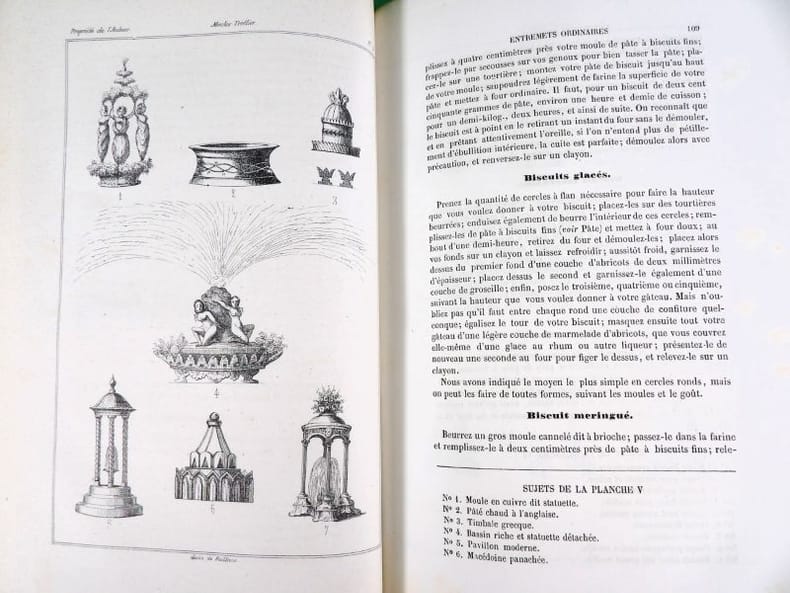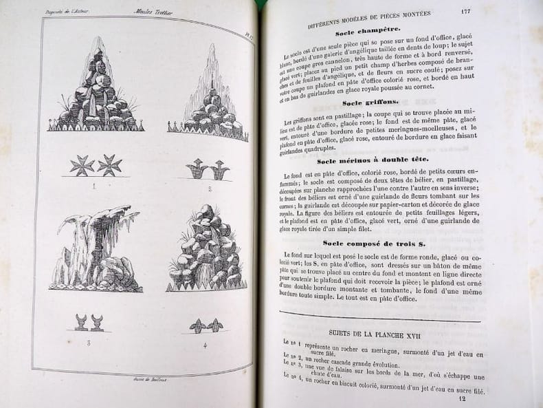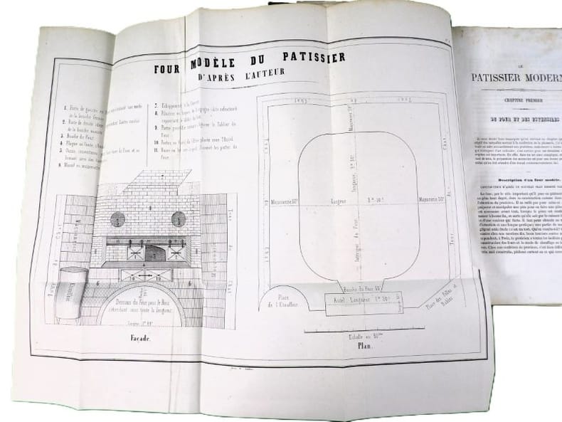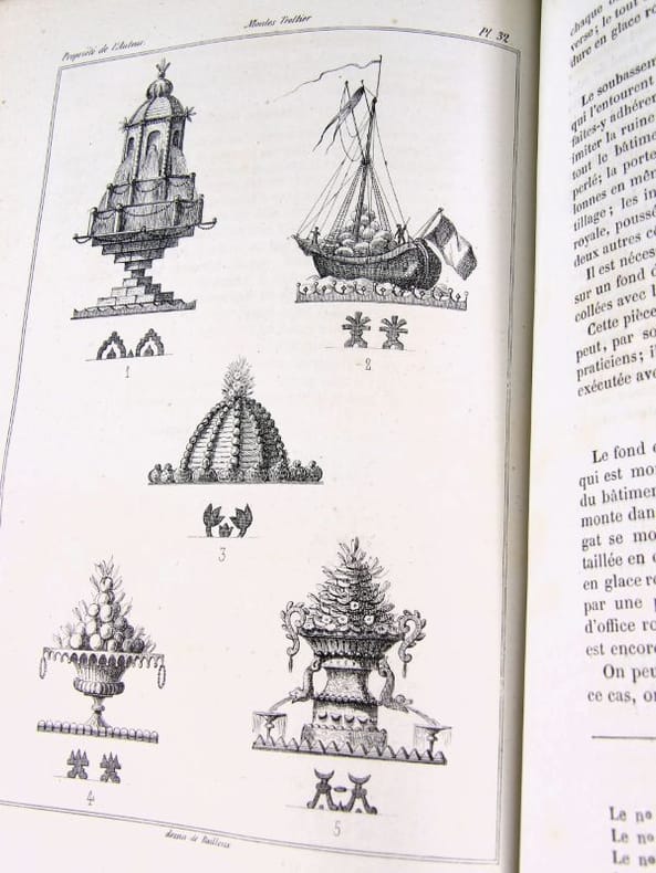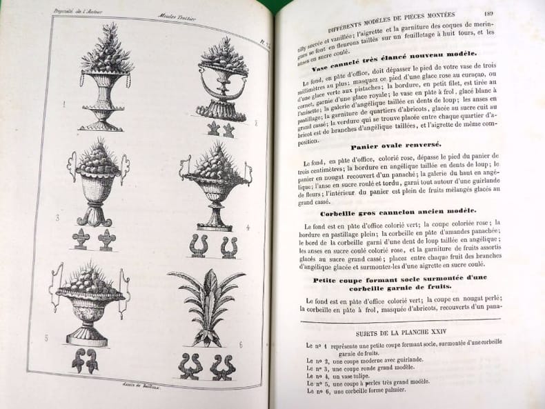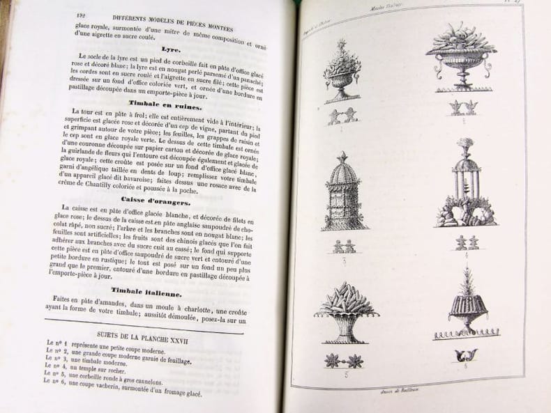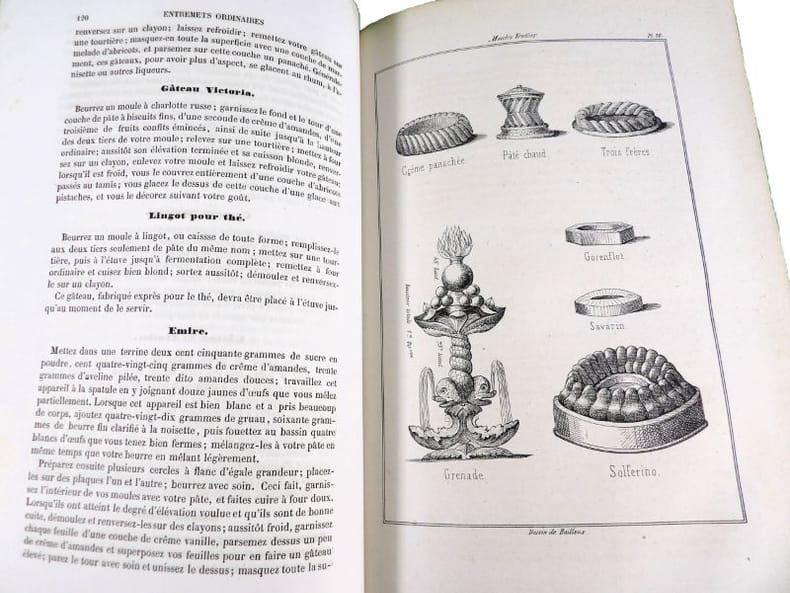 Illustré de 34 planches (dont deux bis), dessinées par l'auteur montrent le four modèle du pâtissier, des décors, des modèles de moules Trottier, et une grande table de dessert. Édition originale. On attribue à l'auteur une place aux côtés de Carême, Gouffé, Garlin et Dubois. 20 ans d'expériences ici rapportées dans une grand nombre d'articles et de recettes. Exemplaire restauré, rousseurs et mouillures, reliure moderne. Vicaire, 61.
