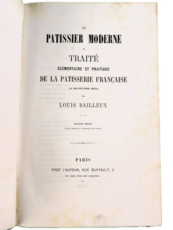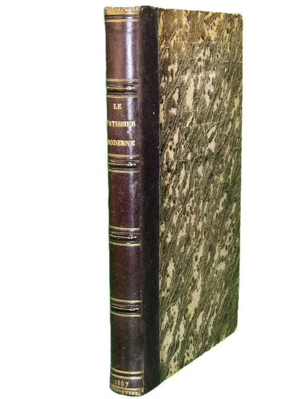 Paris, chez l'auteur, sans date (1860). In-8 - 27 x 18 cm. Reliure de l'époque en demi-chagrin aubergine, dos orné de 4 faux-nerfs ainsi que de dentelle et doubles filets dorés, tranches mouchetées. 279 pages paginées, 38 planches. Mention de troisième édition, revue, corrigée et augmentée par l'auteur, de cet important traité qui parut pour la première fois en 1856 avec seulement 267 pages et 34 planches. Les deux éditions sont rares et il ne semble pas exister de deuxième édition. Exemplaire bien complet de ses 38 planches. Vicaire (62) indique à tort 39 planches, car la planche 35 est double. Tampon à sec au chiffre DM sur la page de titre. L'auteur, qui dans la littérature pâtissière prend place à côté de Carême, Gouffé, Garlin et Dubois, offre ici 20 ans d'expérience en 1400 articles et recettes. Les 38 planches ont été dessinées par lui-même et montrent le four modèle du pâtissier, des décors, des modèles de moules Trottier, et une grande table (10 m, 40 couverts) de "dessert moderne".