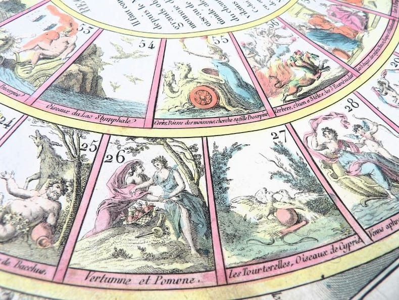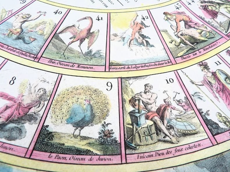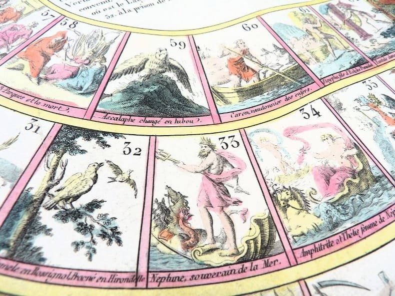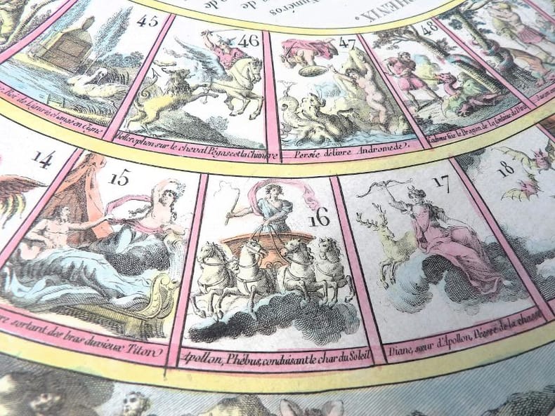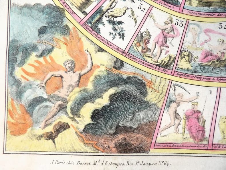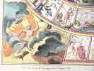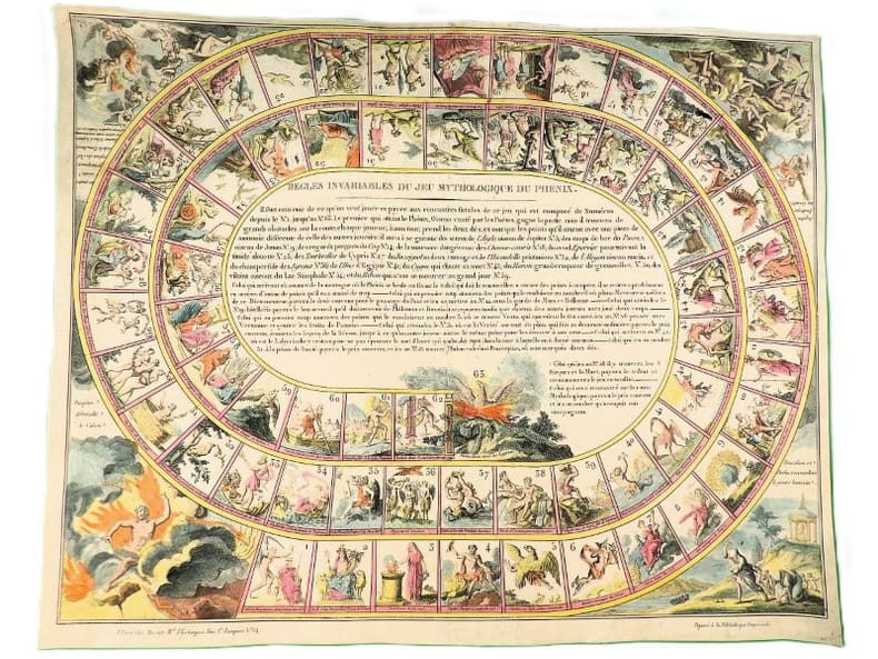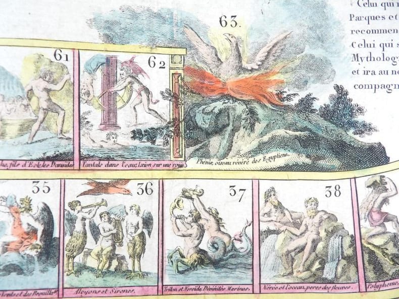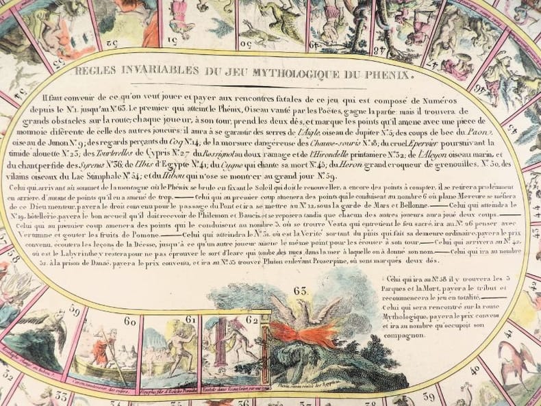 Paris, chez Basset, Md d’estampes Rue Saint-Jacques n° 64, sans date [circa 1810]. 42,2 x 53,5 cm. Une feuille. De belles scènes gravées ornent les angles de ce plateau de jeu : "Diespiter débrouille le Cahos" ; "Deucalion et Pirrha renouvellent le genre humain" ; "Jupiter foudroye les Géants" et "les quatre vents principaux, enfants du Ciel et de la Terre, Borée, Eurus, Notus et Zéphire". Déclinaison du fameux jeu de l’oie, celui-ci permet l'apprentissage ludique de la mythologie en 63 épisodes, jusqu'à l’apparition du Phénix, "oiseau révéré par les Égyptiens" et "vanté par les Poëtes". Pour y parvenir, le joueur devra surmonter de nombreux obstacles. Il lui faudra échapper aux serres de l’Aigle, oiseau de Jupiter (n°5), aux coups de bec du Paon, oiseau de Junon (n°9), aux regards perçants du Coq (n°14), à la morsure dangereuse des Chauve-Souris (n°18), au cruel Épervier poursuivant la timide Alouette (n°23), aux Tourterelles de Cypris (n°27), au Rossignol au doux ramage et à l'Hirondelle printanière (n°32), à l’Alcyon, oiseau marin, et au chant trompeur des Syrenes [Sirènes] (n°36). Il lui faudra également éviter l’Ibis d’Égypte (n°41), le Cygne qui chante sa mort (n°45), le Héron, grand croqueur de grenouilles (n°50), les vilains oiseaux du Lac Stimphale (n°54), le Hibou, qui n’ose paraître en pleine lumière (n°59) mais aussi les 3 Parques et la Mort (n°58). Sur son chemin, il croisera Saturne, Vesta, Jupiter, Mercure, Junon, Neptune, Eole, Tantale, Sisyphe, Minerve, Appolon, Hercule, Icare, Vulcain, Persée, Bellérophon chevauchant Pégase, Morphée, Pan, Oedipe, Cerbère, Venus, Caron et bien d'autres personnages mythologiques. Le premier joueur à atteindre le « sommet de la montagne où le Phénix se brûle en fixant le Soleil qui doit le renouveler » remporte la partie. (D'Allemagne, p. 211).