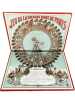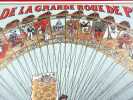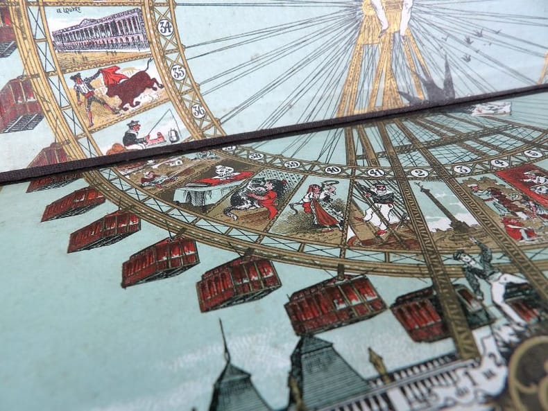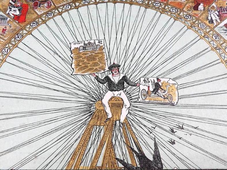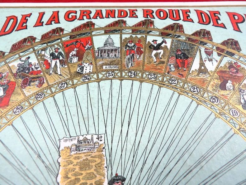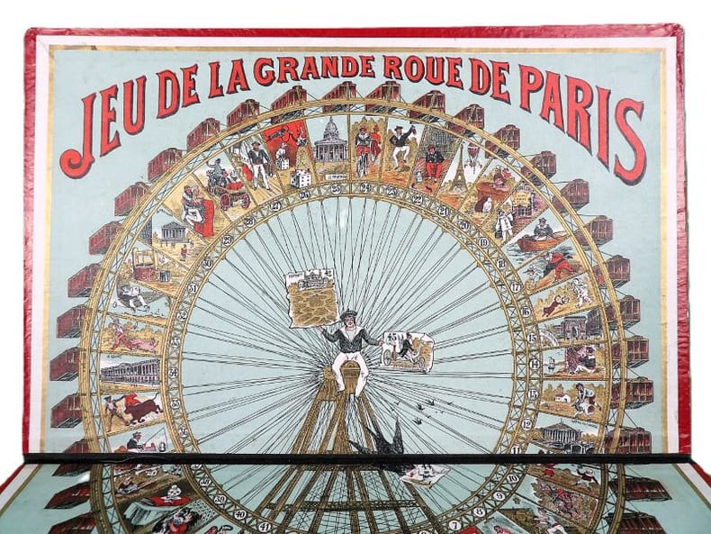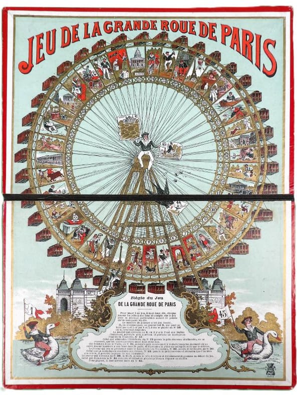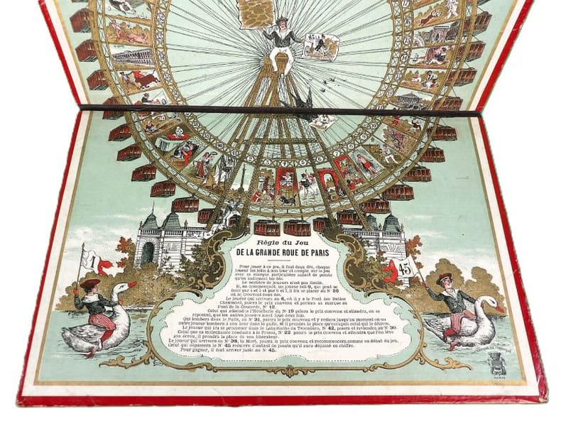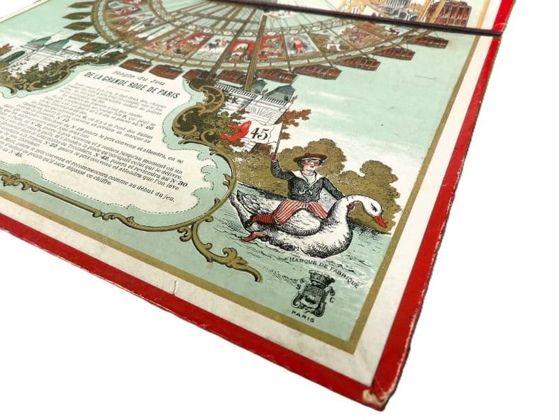Paris, Simonin-Cuny, sans date (circa 1900). Dimension du plateau déplié : 27 x 36 cm. Plateau de jeu pliant, édité à l’occasion de l'Exposition Universelle de Paris en 1900, orné d'une très belle chromolithographie dans des tons principalement rouge, blanc et or. Il s’agit d’un jeu de parcours type jeu de l’oie, de 45 cases seulement. Si l'on retrouve les mêmes cases « pénalisantes » (puits, auberge, prison, …) que dans la version classique, le plateau est ici illustré de personnages, de saynètes comiques ou de célèbres monuments parisiens. Le titre est inscrit en capitales rouges en haut, tandis qu’en bas, le socle de la Grande Roue laisse une place à la règle du jeu (imprimée en noir) et aux cases de départ et d’arrivée (n°1 et 45), symbolisées par des enfants en costume tricolore chevauchant des oies et agitant des bannières.