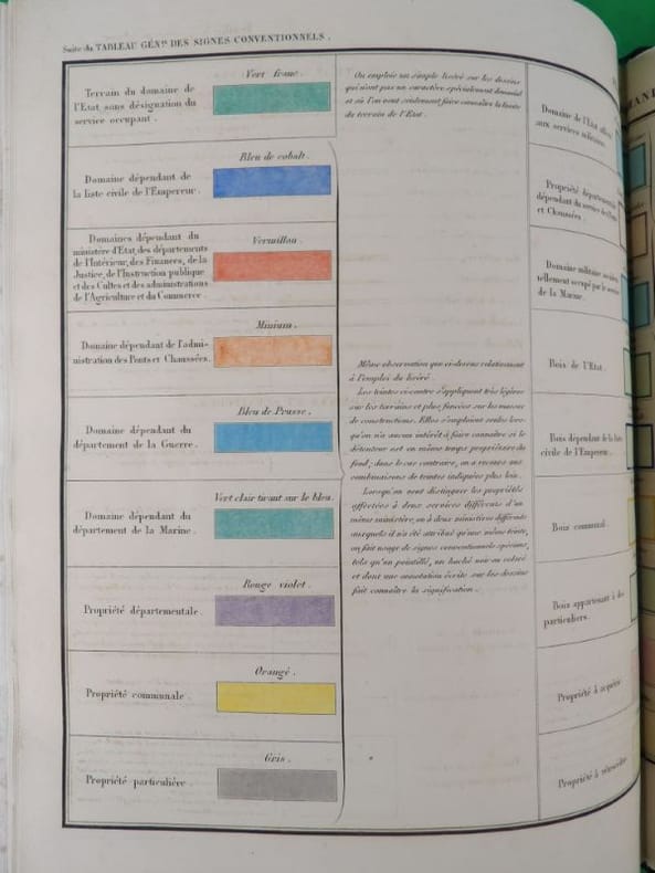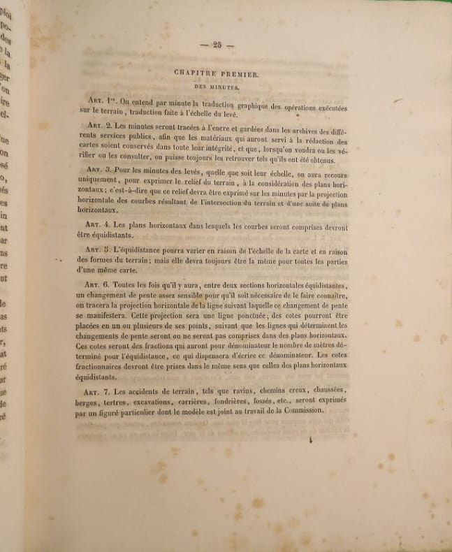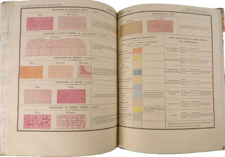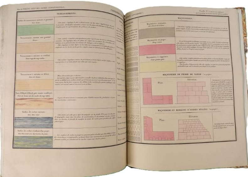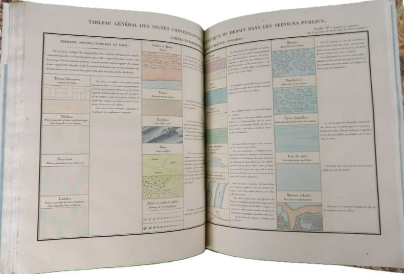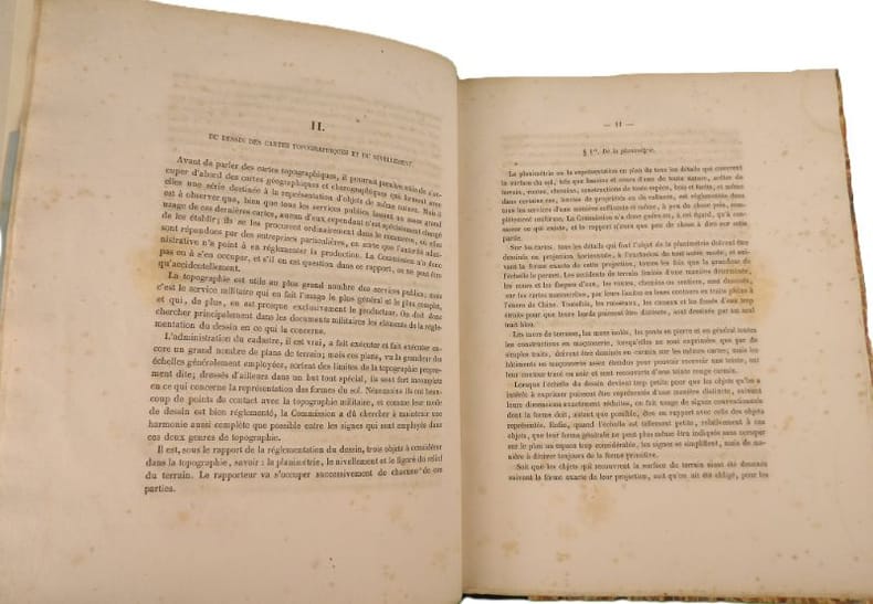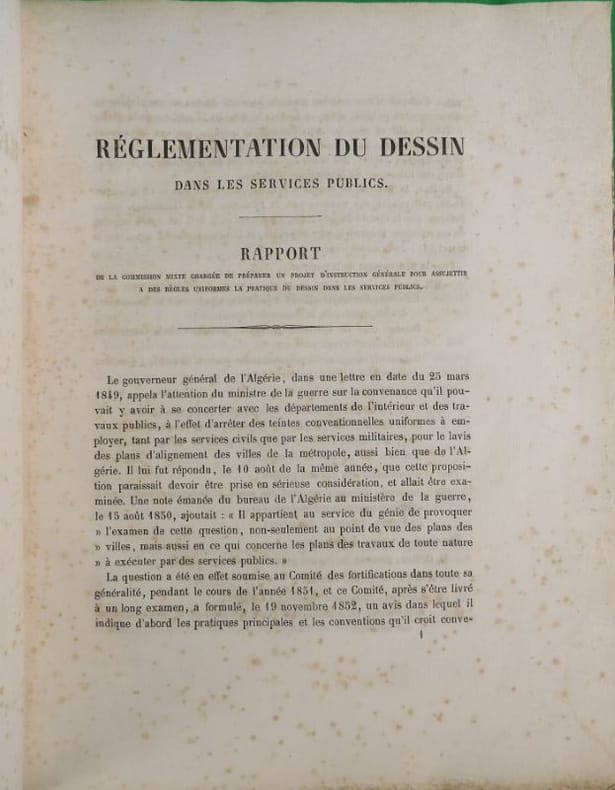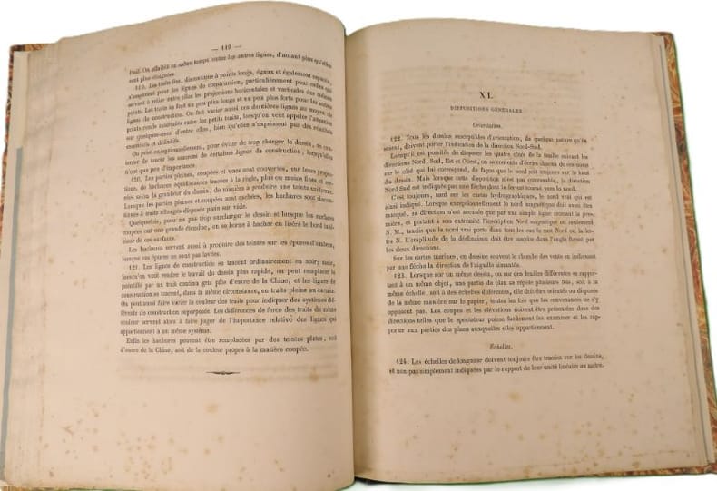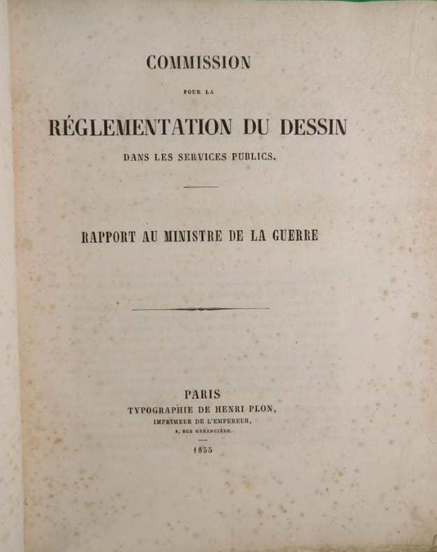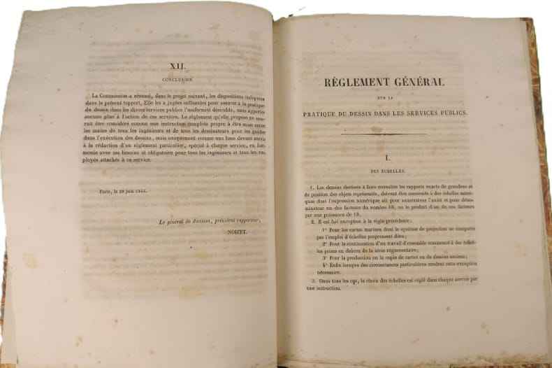 Paris, Typographie de Henri Plon, imprimeur de l'Empereur, 1855. In-4 - 28,5 x 22,5cm. Reliure moderne en demi-chagrin bleu nuit, dos lisse, pièce de titre en chagrin rouge orné de filets dorés, couvertures conservées. 115 pages paginées, 7 planches doubles. Ouvrage qui regroupe les règles pour l'établissement de cartes géographiques, topographiques et marines, de dessins divers, de plans, etc., afin d'uniformiser les conventions. Exemplaire bien complet de ses 7 planches doubles, reliées in fine et aquarellées à la main. Ouvrage de toute rareté, référencé dans seulement 2 collections publiques françaises : la BnF et le Conservatoire National des Arts et Métiers, à Paris.