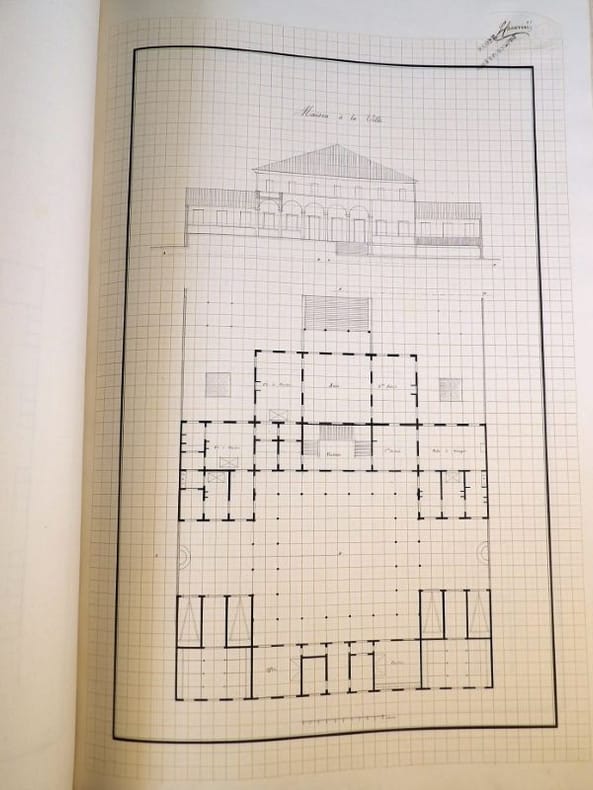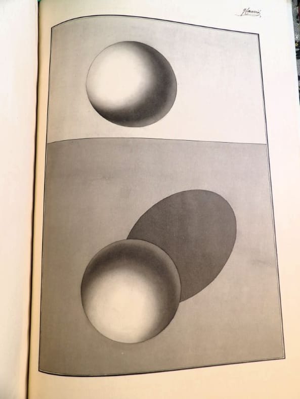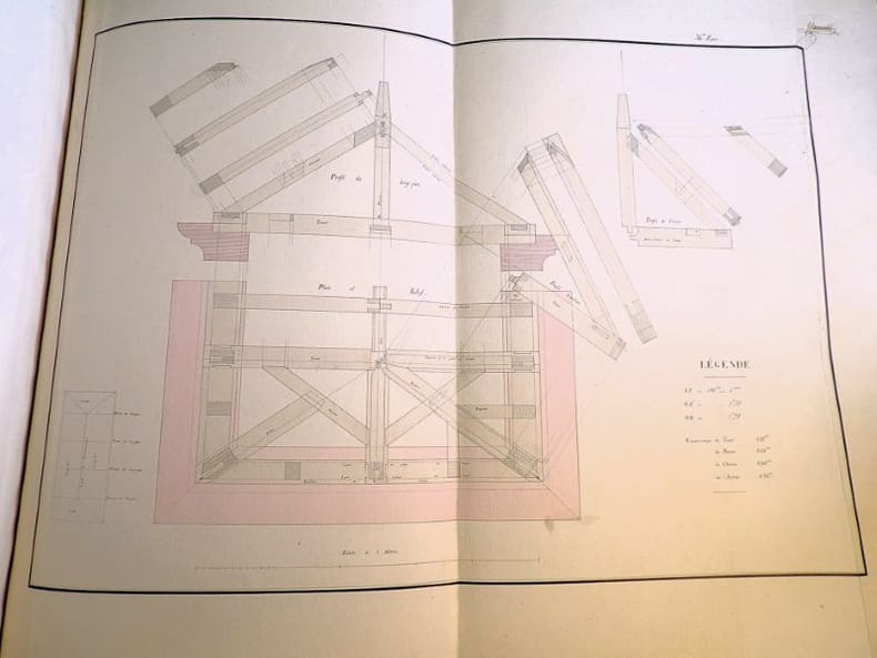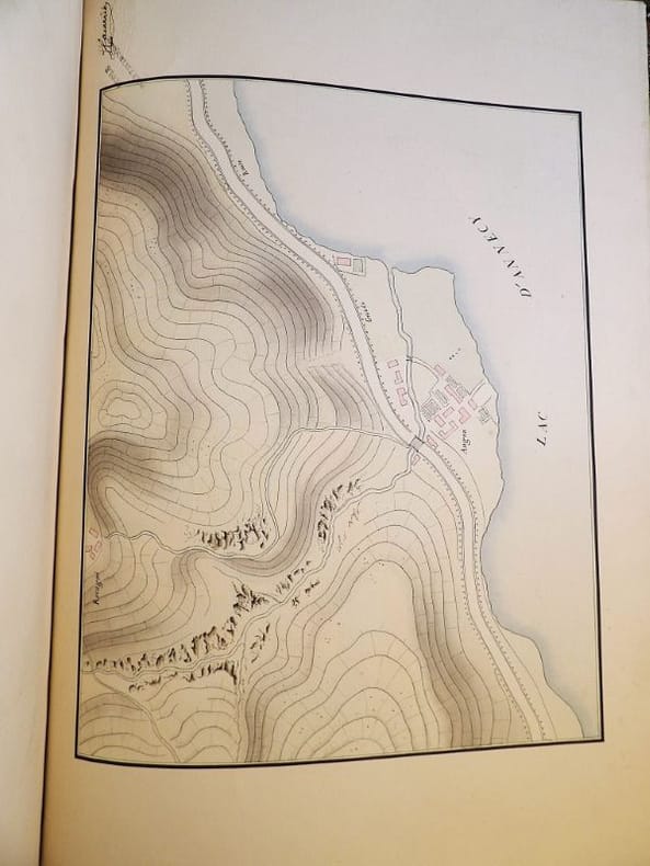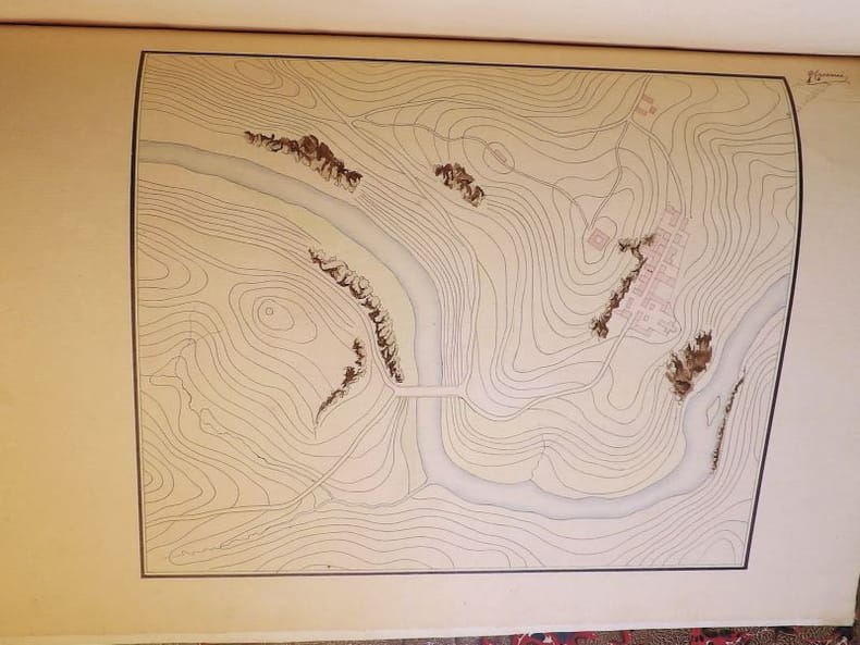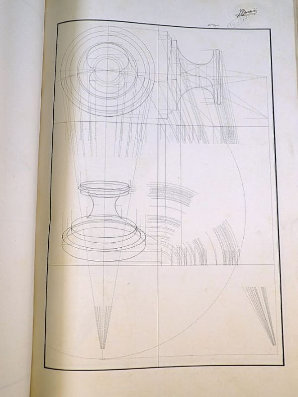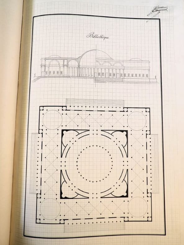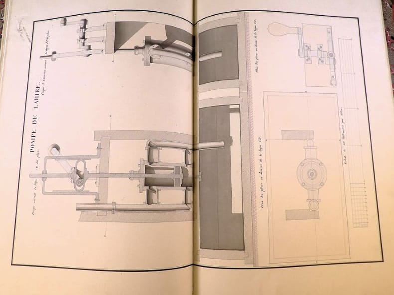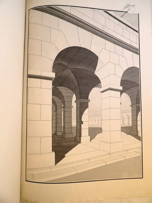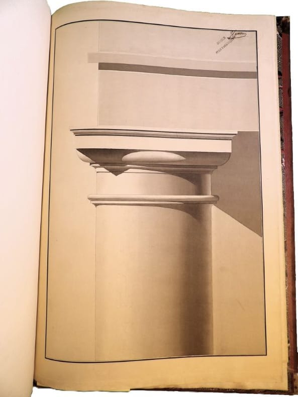 Ecole Polytechnique, sans éditeur, pièce unique manuscrite, 1835-1836 et 1836-1837. 2 Volumes, complet. 80 Planches. 45 x 30,5 cm. Reliure de l'époque en demi-basane grenat à petits coins, dos lisse titré "Épures", orné d'épais filets à froid, ainsi que de doubles caissons, dentelle et filets dorés, pièce de "titre" sur le premier plat "École Polytechnique 1835-1836 / 1836-1837 Cacarrié". 49 planches ; 31 planches. Le 1er livre (1835-1836) contient 38 épures dont 2 dépliantes et aquarellées, toutes réalisées à l'encre et numérotées, suivies de 5 planches de topographie aquarellées, puis d'une planche de typographie à l'encre, et, enfin, de 5 planches de géométrie utilisant la technique du lavis (gris, blanc et noir). Le second volume (1836-1837) contient 16 planches d'architecture, suivies de 3 planches doubles techniques, aquarellées (dont une première "pompe de Lahire"), d'une planche double de projections, d'une planche de coupes de la pompe de Lahire à l'encre, puis de 4 dessins architecturaux au lavis (dont un double), et se termine par 6 planches topographiques aquarellées (dont une du Lac d'Annecy). Toutes les pages comportent le tampon à sec "Ecole polytechnique" (parfois accompagné du tampon humide également) et la signature de l'élève.