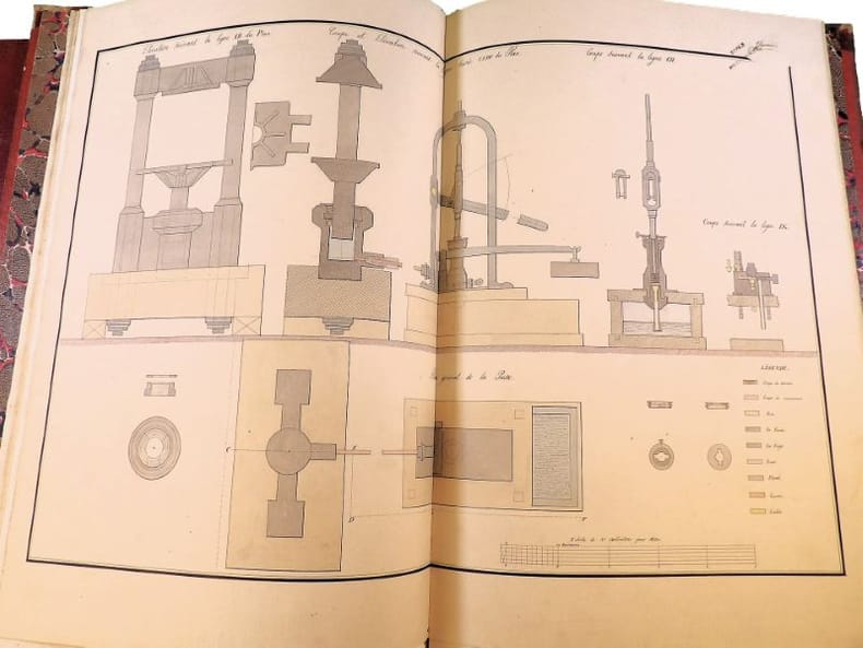 Traces de frottements, principalement sur la reliure du volume 1836-1837, sinon très bel état de conservation de ce magnifique ensemble qui démontre le talent d'un élève de l'Ecole Polytechnique au parcours d'excellence. Mathieu-(Jean-Joseph-Vincent) Cacarrié (1816-1894) connaît une longue et brillante carrière de haut fonctionnaire au XIXe siècle : c'est avec la promotion 1835 qu'il intègre l'Ecole Polytechnique d'où il sort 6ème sur 107. Il poursuit sa formation à l'Ecole des Mines et participe aux levés de la carte géologique du Maine-et-Loire. En 1858, il est attaché à l'administration du Chemin de Fer de Graissessac dans l'Hérault, et est élu membre de l'Académie des Sciences et Lettres de Montpellier. Deux ans plus tard, il occupe le poste de Chef du contrôle et de l'exploitation du Chemin de Fer de Carmaux à Albi. Il quitte le sud en 1863, monte à Saint-Etienne, et est chargé du Chemin de Fer de Paris à Lyon par le Bourbonnais. En 1868, il devient Directeur de l'Ecole des Mines de Saint-Etienne. C'est en mai 1873 qu'il s'installe à Paris et occupe le poste de Directeur du contrôle et de l'exploitation des Chemins de fer de l'Ouest. A sa retraite, en 1881, il se retire dans les Deux-Sèvres. - Clients Livre Rare Book : Les frais postaux indiqués sont ceux pour la France métropolitaine et la Corse, pour les autres destinations, merci de contacter la librairie pour connaître le montant des frais d'expédition, merci de votre compréhension. Livre Rare Book Customers : The shipping fees indicated are only for France, if you want international shipping please contact us before placing your order, thank you for your understanding. - Frais de port : -Colissimo France 17 € -Colissimo International (Union Européenne + Suisse : 30 €) (Reste du Monde : 80 €)