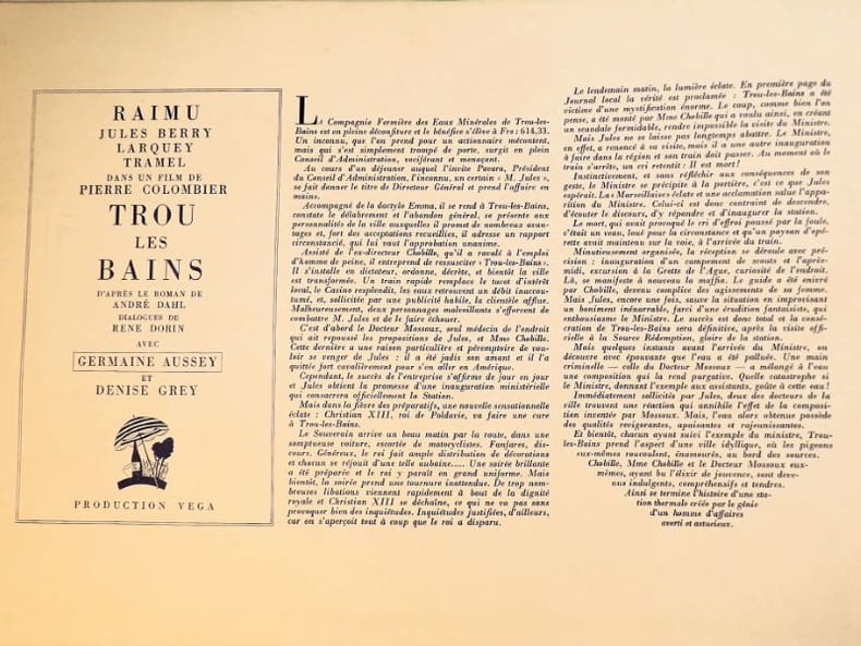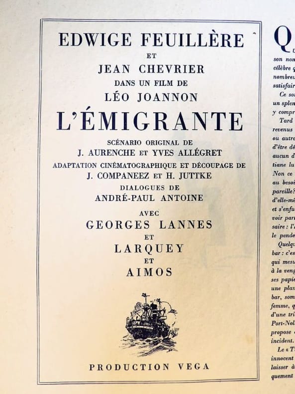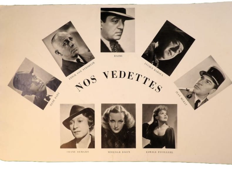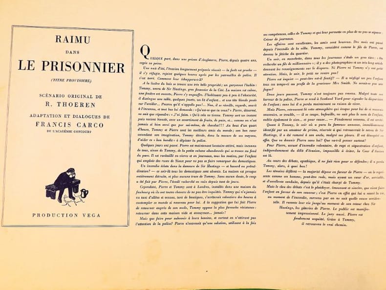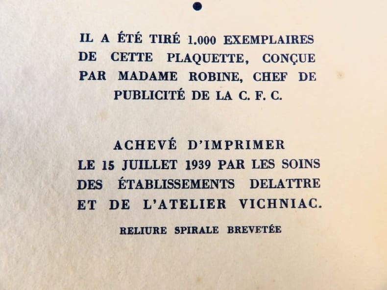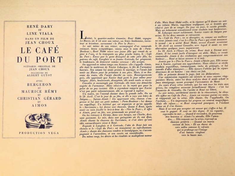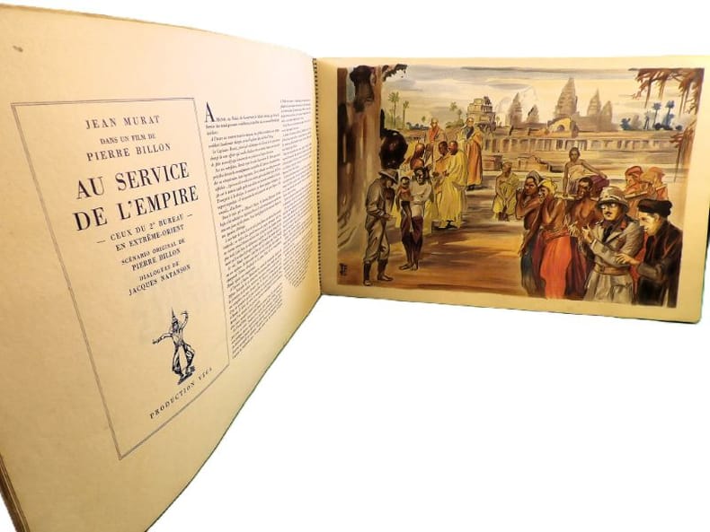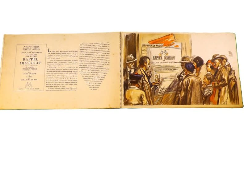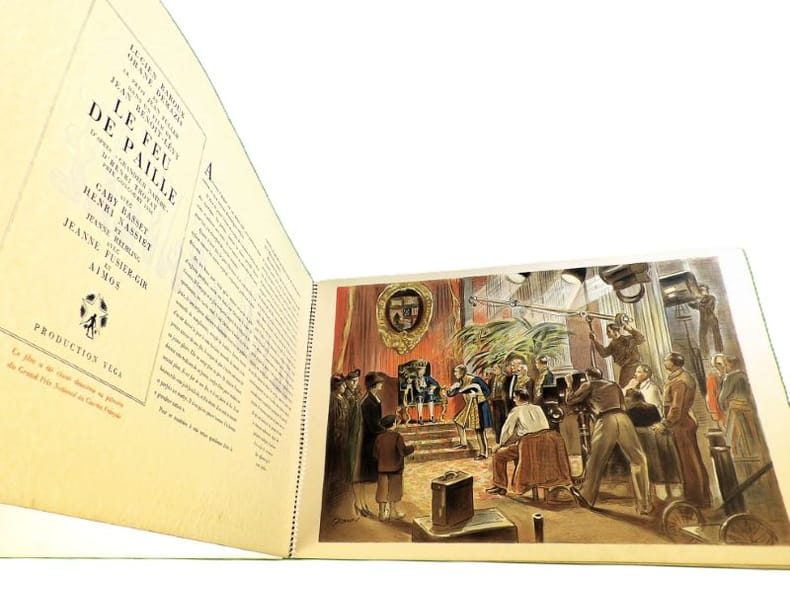 Paris, 1939. Format à l'italienne, 48 x 31 cm. Relié avec une spirale métallique brevetée. 19 pages. Très rare catalogue publicitaire destiné à la présentation des 8 films que compte produire, pour la saison 1939-1940, la Compagnie française cinématographique, en collaboration avec la société des films Vega. Une présentation succinte de la CFC - fondée en 1934 -, de ses projets pour l'année et de son équipe dirigeante inaugure l'album, puis un feuillet s'orne des portraits photographiques de 6 metteurs en scène des films annoncés, ainsi que de 8 actrices et acteurs "vedettes" (René Dary, Erich Von Stroheim, Raimu, Lucien Baroux, Jean Murat, Orane Demazis, Mireille Balin, Edwige Feuillère). Chaque film bénéficie de 3 pages : le titre en typographie ornementale, une fiche technique avec la distribution et le synopsis, et surtout une lithographie en couleurs à pleine page signée, réalisée expressément pour cette publication par des illustrateurs renommés, indépendamment des affiches "officielles". Se succèdent donc : -Rappel immédiat, de Léon Mathot, avec Mireille Balin, Roger Duchesne, Bernard Lancret et Erich Von Stroheim. Illustration de Dominique Charles Fouqueray (1869-1956); -Le Café du port, de Jean Choux, avec René Dary, Line Viala, etc. Illustration de Mathurin Méheut (1882-1958) ; -Le feu de paille, de Jean Benoît-Lévy, avec Lucien Baroux et Orane Demazis. Illustration de Lucien Jonas (1880-1947) ; -L'Emigrante, de Léo Joannon, avec Edwige Feuillère, Jean Chevrier, Georges Lannes, etc. Scénario de Jean Aurenche et Yves Allégret. Illustration d'Albert Sébille (1874-1953) ; -La route de feu, de Léon Mathot. Illustration de Géo Ham (1900-1972) ; -Trou les Bains, de Pierre Colombier, avec Raimu, Jules Berry, Germaine Aussey, Denise Grey, etc. Illustration de Bernard Lancy (1892-1964) ; -Au service de l'Empire, de Pierre Billon, avec Jean Murat. Illustration de Dominique Charles Fouqueray ; -Le Prisonnier (titre provisoire), scénario original de Robert Thoeren, adaptation et dialogues de Francis Carco, avec Raimu. Illustration de Lucien Jonas.Achevée d'imprimer le 15 juillet 1939, et tirée à un millier d'exemplaires, cette plaquette promotionnelle conçue par Madame Robine, chef de publicité de la C.F.C., paraît donc dans un contexte de paix. Mais si les 4 premiers films ont bien été produits (La sortie du Feu de paille a cependant été reportée à 1941), les conséquences de l'entrée en guerre en septembre, puis de la défaite de mai 1940 et de l'Occupation allemande semblent avoir eu raison des 4 derniers, dont nous n'avons trouvé trace. Précieux et intéressant catalogue, à notre connaissance non référencé dans les collections institutionnelles.