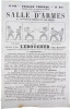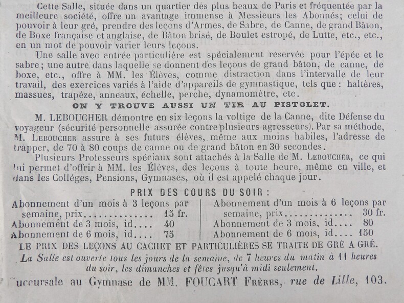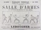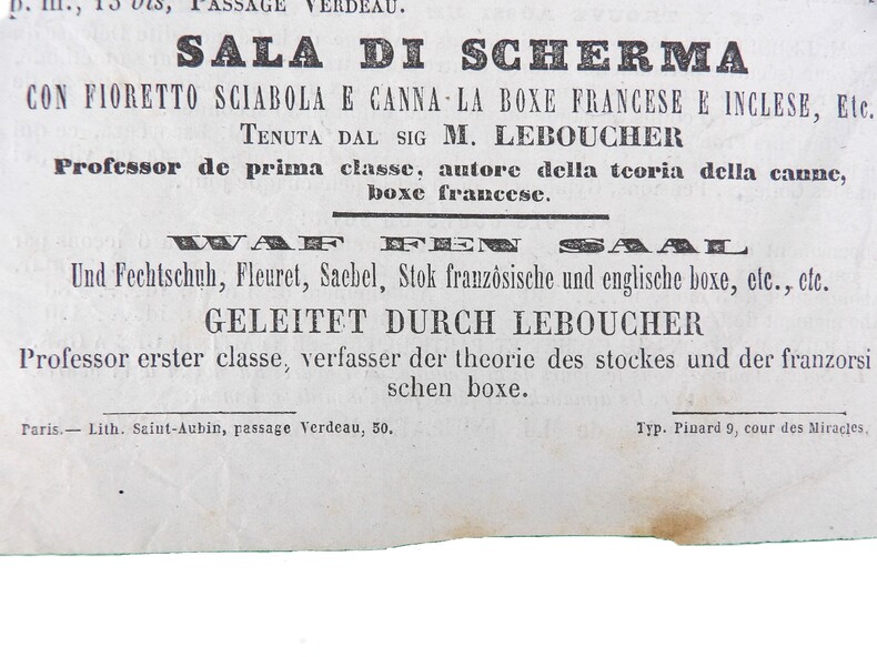 Paris, sans mention d'éditeur (lithographie Saint-Aubin, typographie Pinard), sans date (circa 1850). Dimensions : 22 x 14 cm. 1 feuillet recto,verso. Rare et original feuillet publicitaire quadrilingue (français, anglais, italien et allemand) et illustré de vignettes gravées représentant les disciplines enseignées : escrime, canne et bâton, boxe française et anglaise, gymnastique et tir. Document précoce, témoignant de la diffusion en Europe des pratiques d'autodéfense civile à Paris à la fin des années 1840. A une période charnière précédant la codification moderne de la boxe française et de la canne, ce feuillet publicitaire constitue une peu courante et précieuse source d'informations sur l’organisation et le fonctionnement d’une salle d’armes. Par l’association de textes et de vignettes gravées, ce document est un remarquable témoignage de l'émergence d’un enseignement martial urbain à vocation commerciale au milieu XIX siècle.