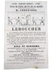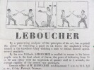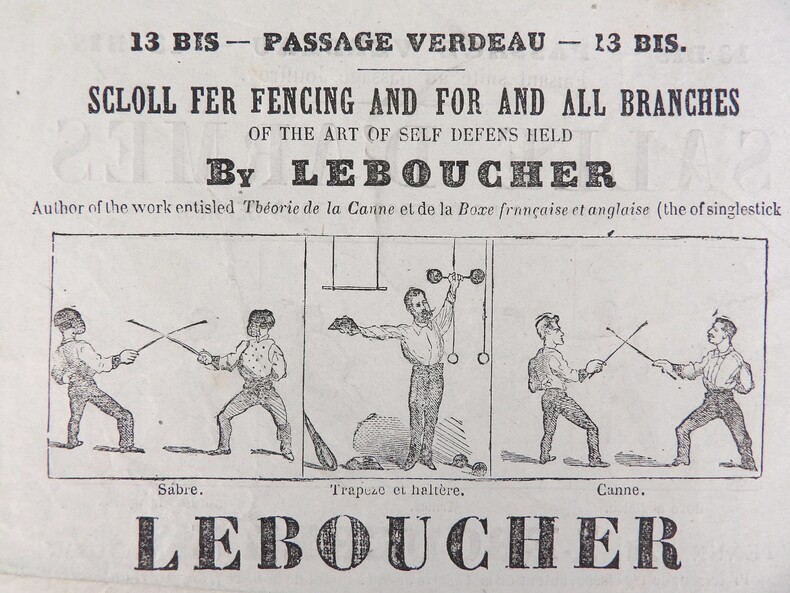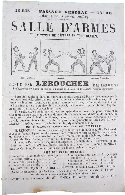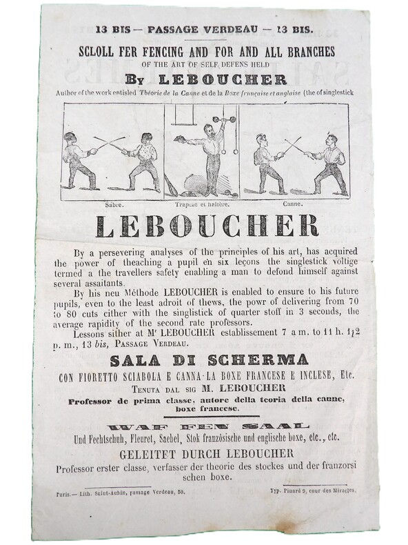 Quelques traces de pliures et un infime défaut en pied, sinon très bel état de conservation. Louis Armand Victorin Leboucher (1807–1866) est un maître d’armes et professeur de self-défense actif à Paris au milieu du XIX siècle. Installé au 13 bis, passage Verdeau, il dirige une salle d’armes où il enseigne l’escrime (fleuret et sabre), la canne et le bâton, ainsi que la boxe française et anglaise, complétées par des exercices de gymnastique et le tir au pistolet. Auteur de la "Théorie de la Canne et de la Boxe française et anglaise", il développe notamment une méthode de « défense du voyageur », destinée à permettre à un civil de se protéger contre plusieurs agresseurs. Son enseignement, présenté comme méthodique et efficace, semble avoir bénéficié d’une clientèle bourgeoise et internationale. Leboucher – Fencing Salle, Cane and French & English Boxing. Rare illustrated advertising leaflet, Paris, circa 1850. Printed recto and verso, this prospectus advertises the courses offered by M. Leboucher, fencing master established at 13 bis, Passage Verdeau, Paris. Instruction includes fencing, cane and stick fighting, French and English boxing, gymnastics, and pistol shooting. Text in French, English, Italian, and German, illustrated with engraved vignettes depicting the various disciplines taught. A remarkable document for the history of self-defence and urban martial practices in the nineteenth century. Very good overall condition, with only slight traces of folding and a small marginal stain at the lower edge. - Clients Livre Rare Book : Les frais postaux indiqués sont ceux pour la France métropolitaine et la Corse, pour les autres destinations, merci de contacter la librairie pour connaître le montant des frais d'expédition, merci de votre compréhension. Livre Rare Book Customers : The shipping fees indicated are only for France, if you want international shipping please contact us before placing your order, thank you for your understanding. - Frais de port : -Lettre suivie France 9 € -Colissimo International (Union Européenne + Suisse : 20 €) (Reste du Monde : 40 €) -Lettre suivie internationale 26 €
