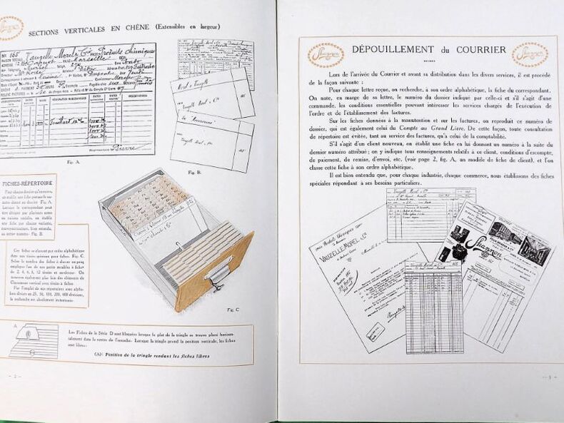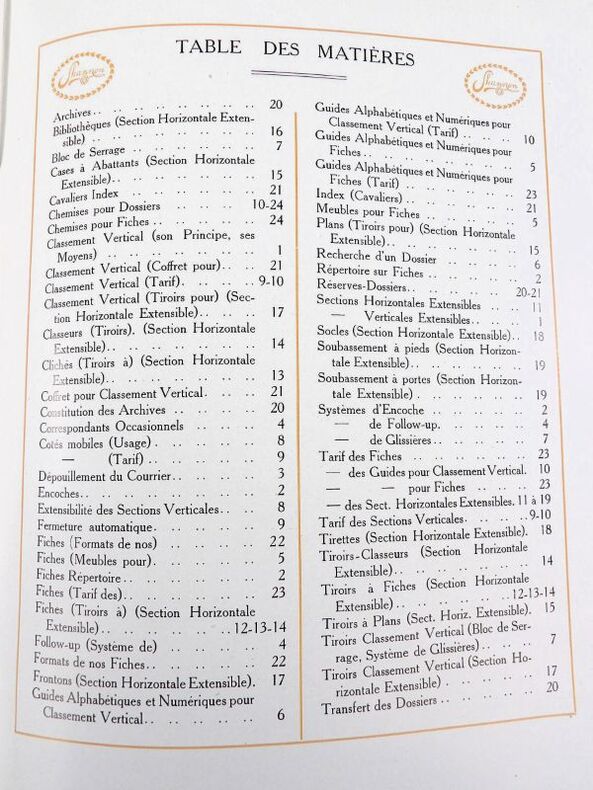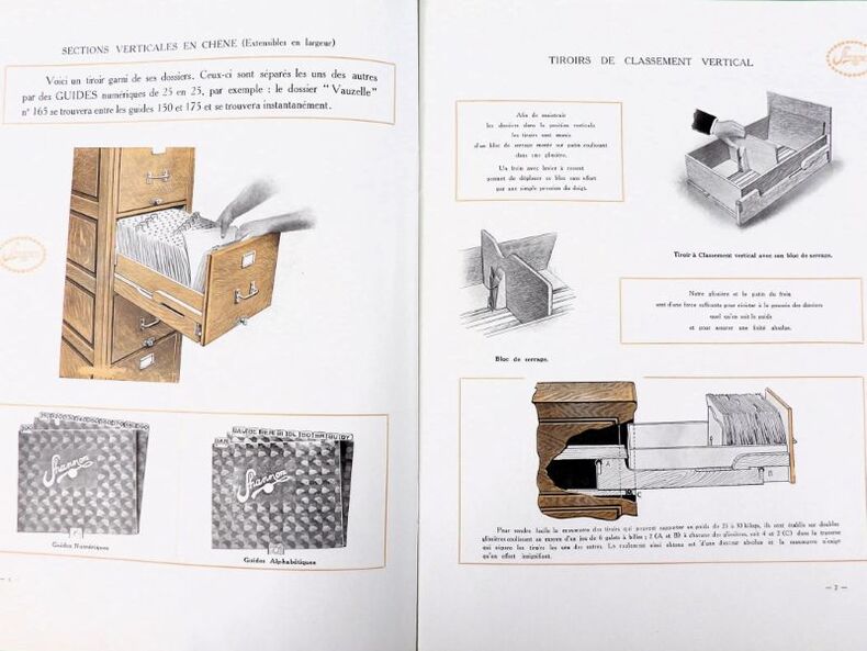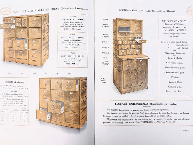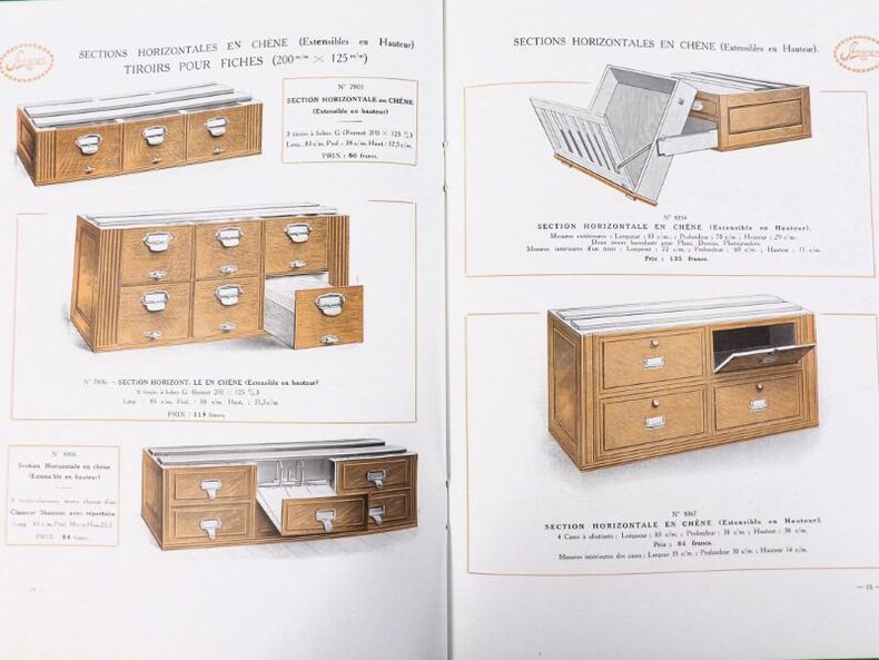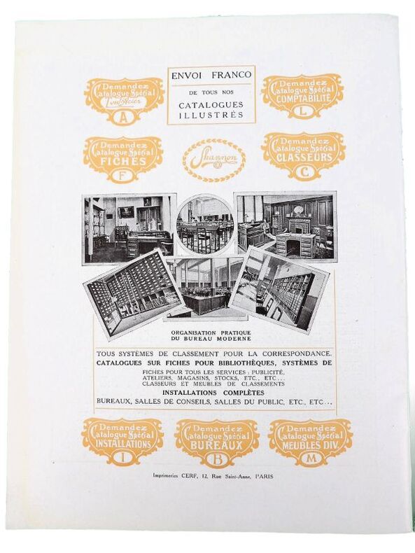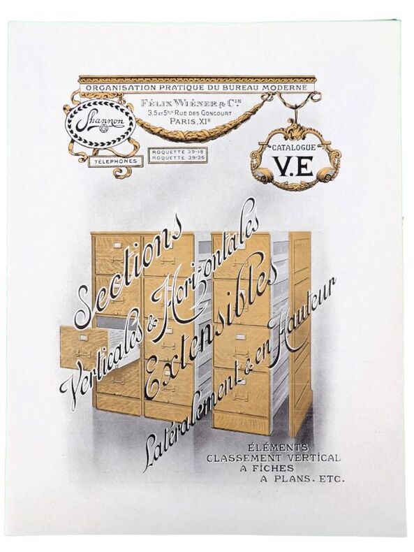 Paris, Félix Wiéner & Cie (Imprimerie Cerf), sans date (circa 1913). 24,5 x 19 cm. Broché, couvertures illustrées. 24 pages paginées. Elégant catalogue, richement illustré et partiellement en couleurs, de mobilier de classement et dossiers pour bureaux, administrations ou encore bibliothèques.