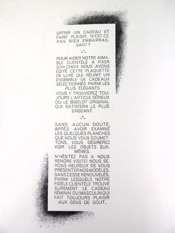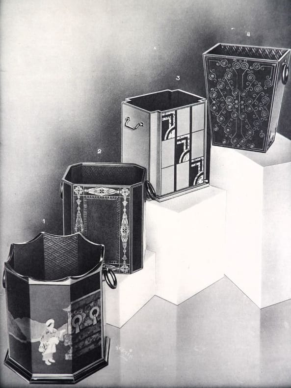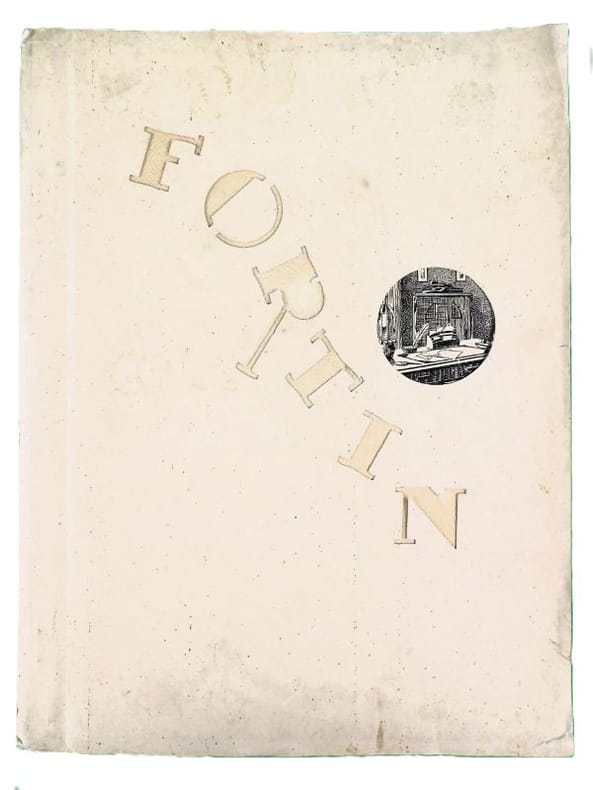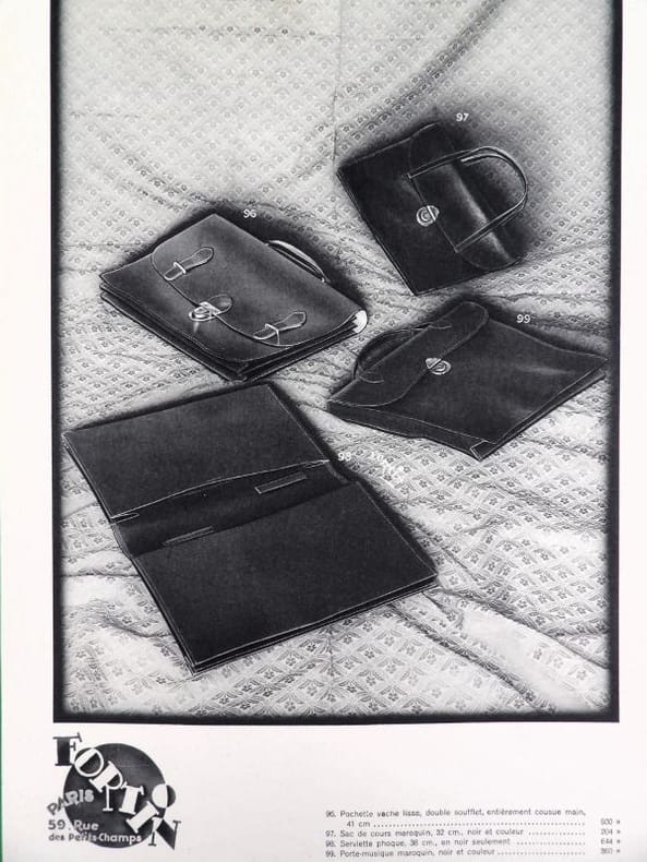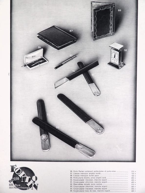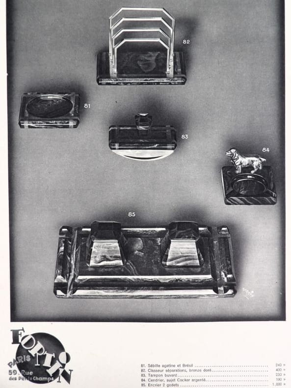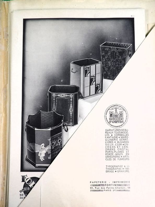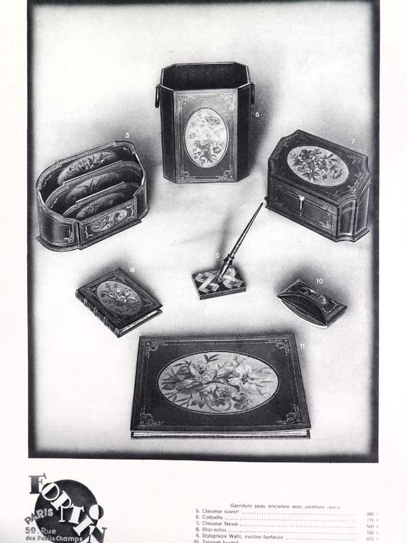 Paris, Fortin, sans date (circa années 1920-1930). 32,5 x 25 cm. Broché, premier avec une découpe au nom du papetier et permettant de voir la gravure del la première page. 1 Serpente, 1 feuillet de titre, 1 serpente, 16 planches libres. Catalogue de luxe, complet de ses 16 planches présentant 99 articles : garnitures de bureaux, corbeilles, maroquinerie, serre-livres, buvards, encriers, cendriers, porte-plumes et porte-mines, articles de fumeurs, etc.