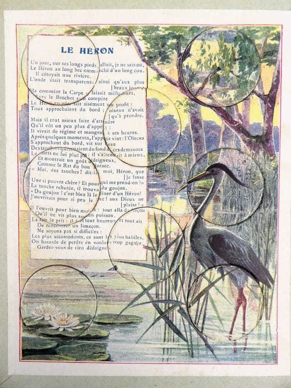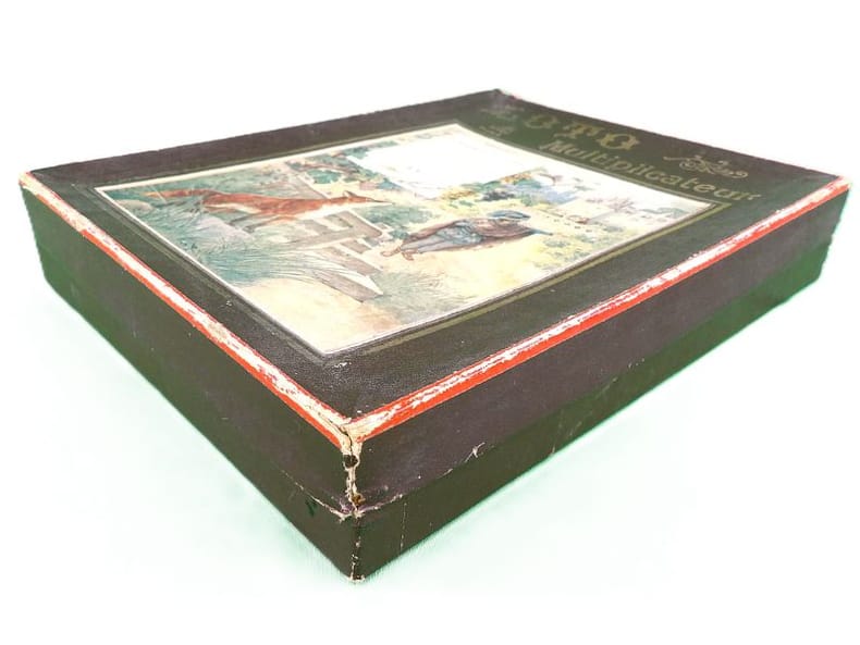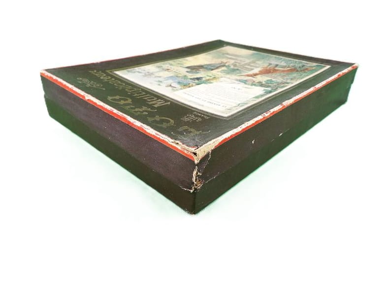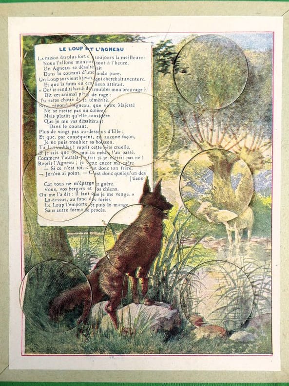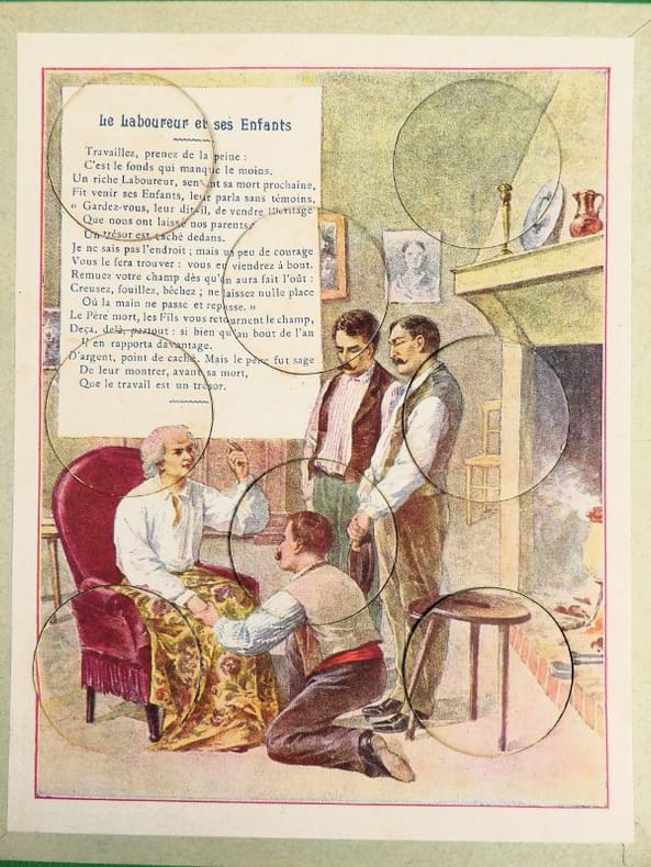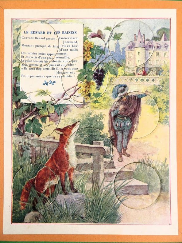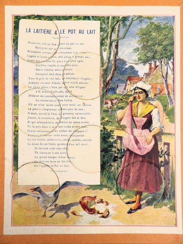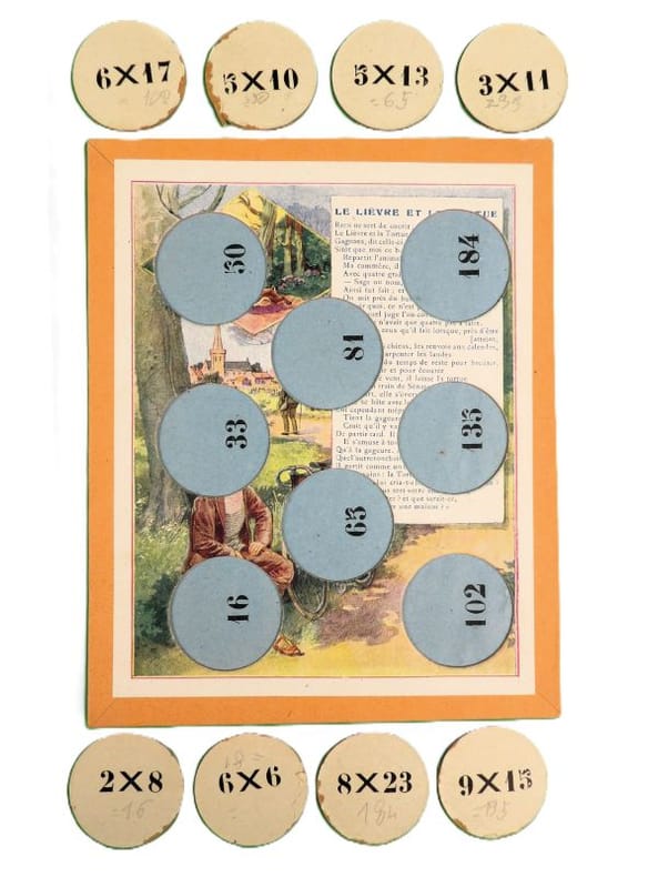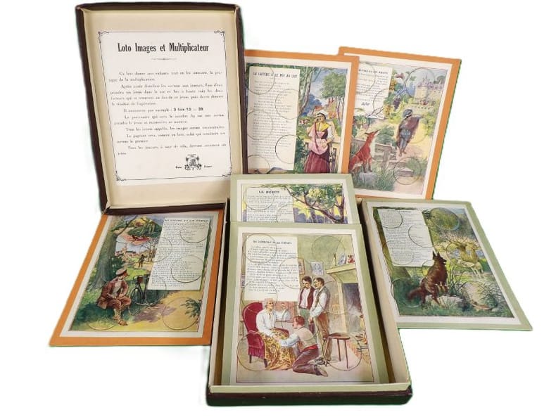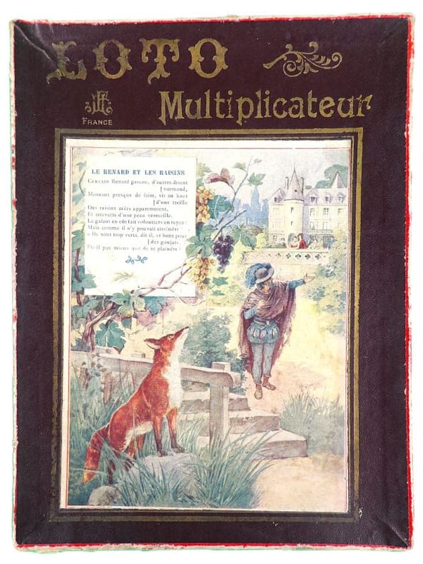 Sans lieu, JJF (Jeux et Jouets Français) sans date (ca 1910). Boîte : 24 x 18 x 4 cm. Rare jeu complet de ses 6 planches illustrées et de tous ses jetons. Chaque carton comporte sa fable : le lièvre et la tortue ; le loup et l'agneau ; le héron ; le laboureur et ses enfants ; le renard et les raisins ; la laitière et le pot au lait. On obtient la valeur du jeton grâce au produit de la multiplication qui se trouve au verso, son recto permet de complet l'illustration de la planche. Ce jeu pédagogique et éducatif permettait d'enseigner les mathématiques aux enfants tout en leur faisant découvrir ce classique de la littérature française.