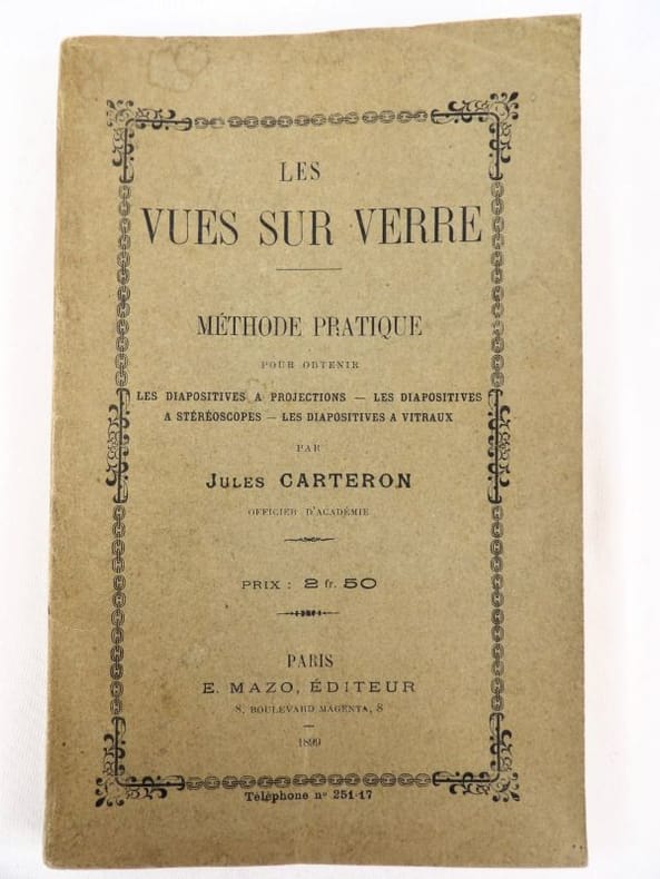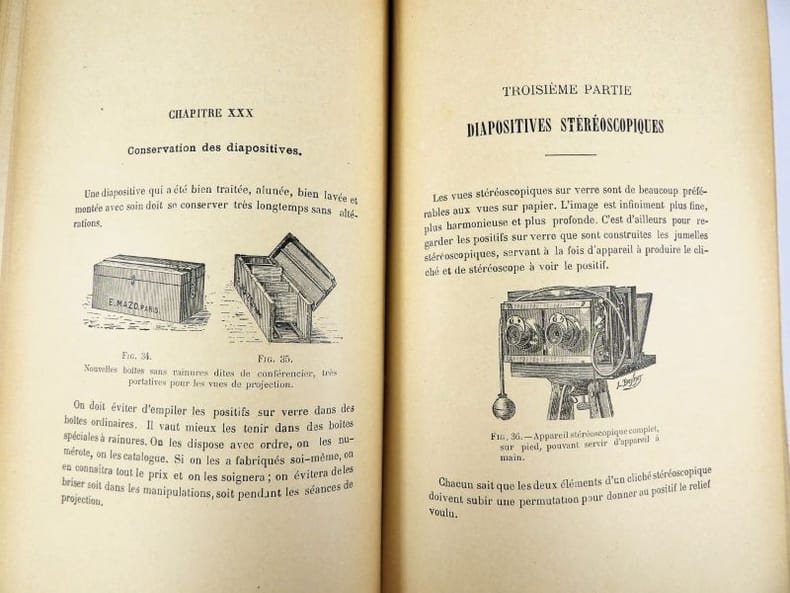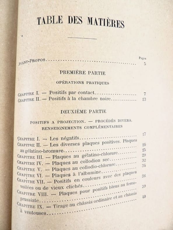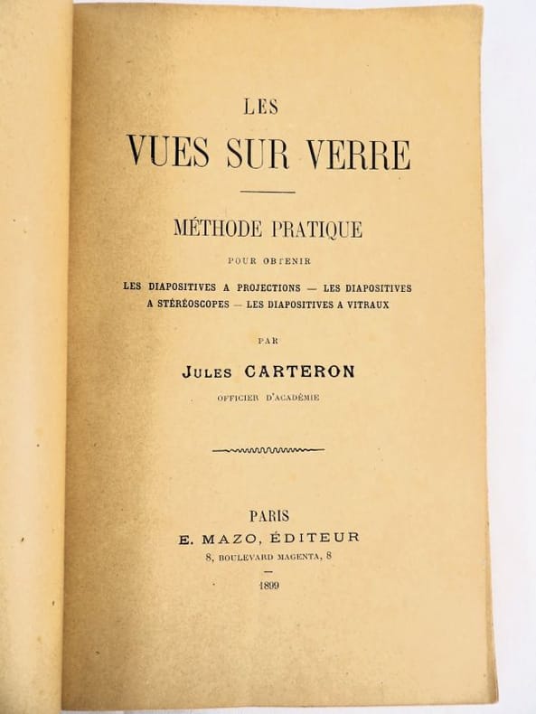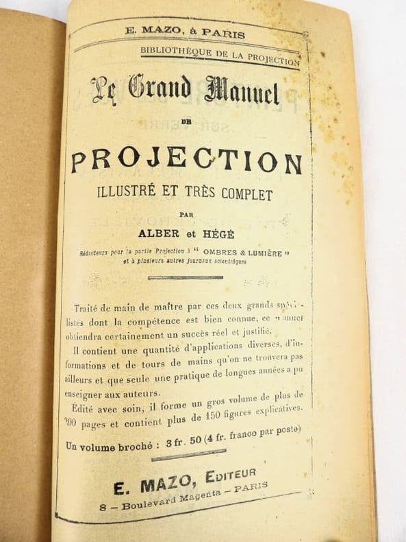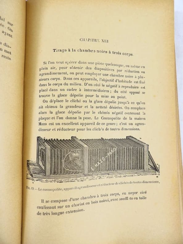 Paris, Mazo, 1899. In-8 - 21,5 x 13,5 cm. Broché, couverture et dos titrés. 157 pages paginées, 1 feuillet, 8 feuillets de catalogues. Ouvrage illustré, divisé en 6 parties : opérations pratiques ; positifs à projection - procédés divers, renseignements complémentaires ; diapositives stéréoscopiques ; notes et renseignements ; mode d'emploi des principales plaques françaises et étrangères - notice des fabricants. L'ouvrage s'achève sur 8 feuillets illustrés, catalogue de l'éditeur sur les mêmes sujets. Ouvrage de toute rareté dont nous n’avons trouvé aucun exemplaire dans les collections publiques à travers le monde.