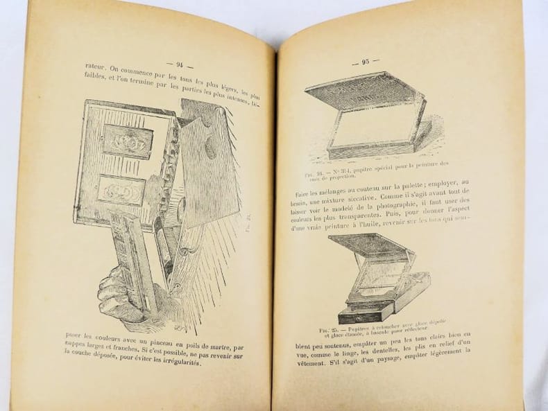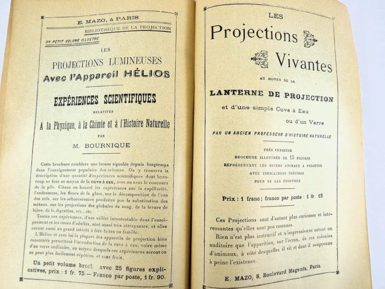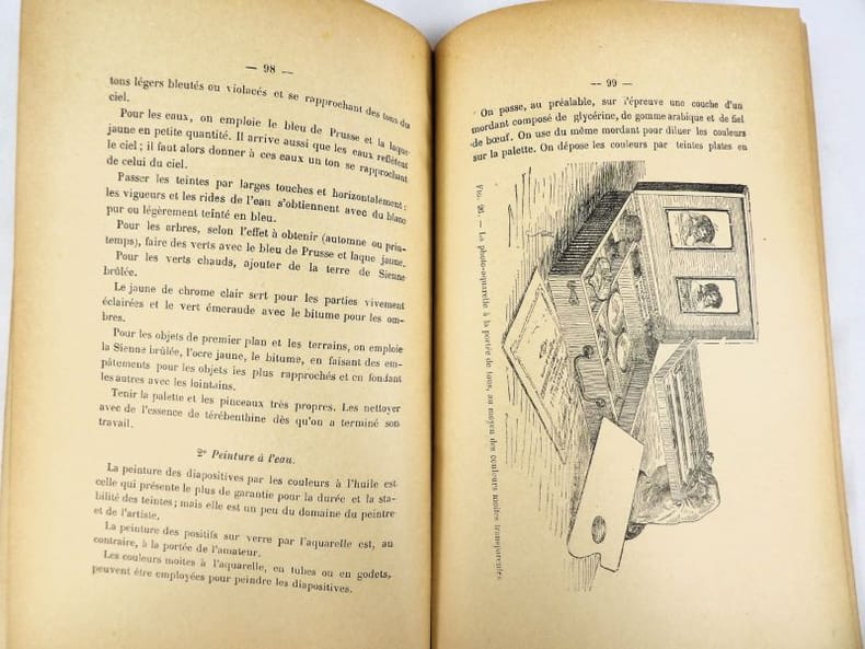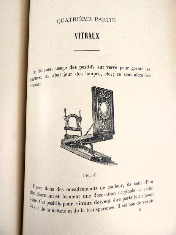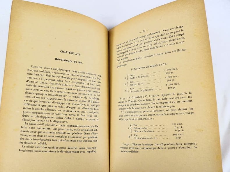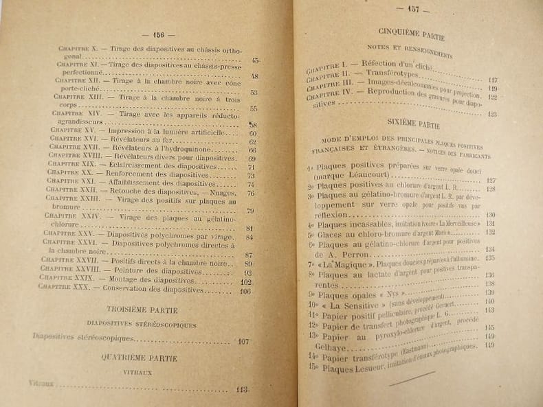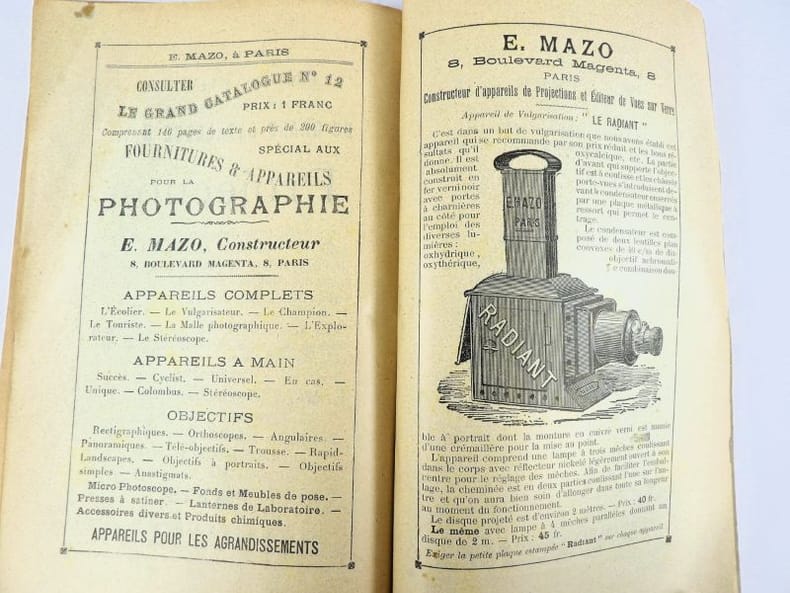 Paris, Mazo, 1899. In-8 - 21,5 x 13,5 cm. Broché, couverture et dos titrés. 157 pages paginées, 1 feuillet, 8 feuillets de catalogues. Ouvrage illustré, divisé en 6 parties : opérations pratiques ; positifs à projection - procédés divers, renseignements complémentaires ; diapositives stéréoscopiques ; notes et renseignements ; mode d'emploi des principales plaques françaises et étrangères - notice des fabricants. L'ouvrage s'achève sur 8 feuillets illustrés, catalogue de l'éditeur sur les mêmes sujets. Ouvrage de toute rareté dont nous n’avons trouvé aucun exemplaire dans les collections publiques à travers le monde.