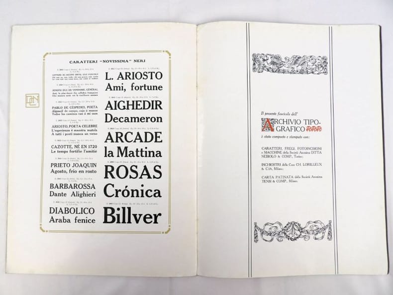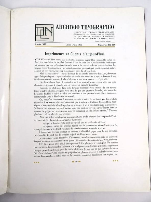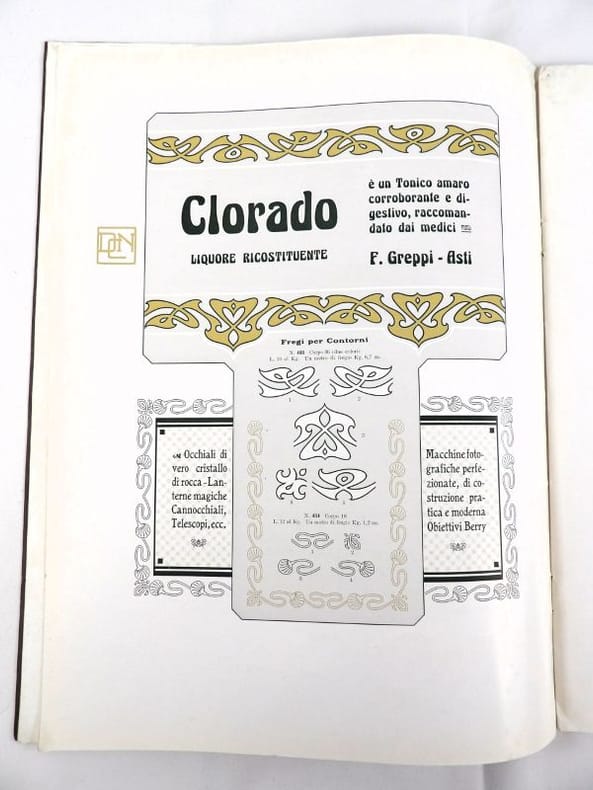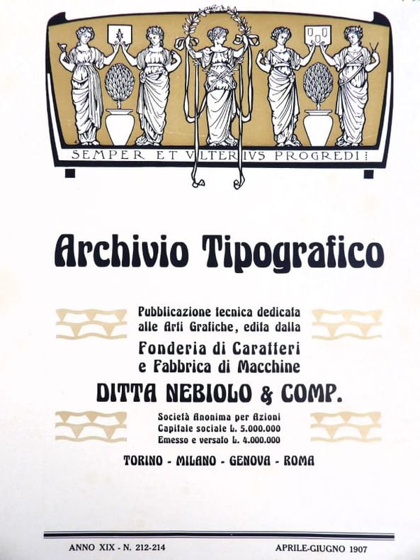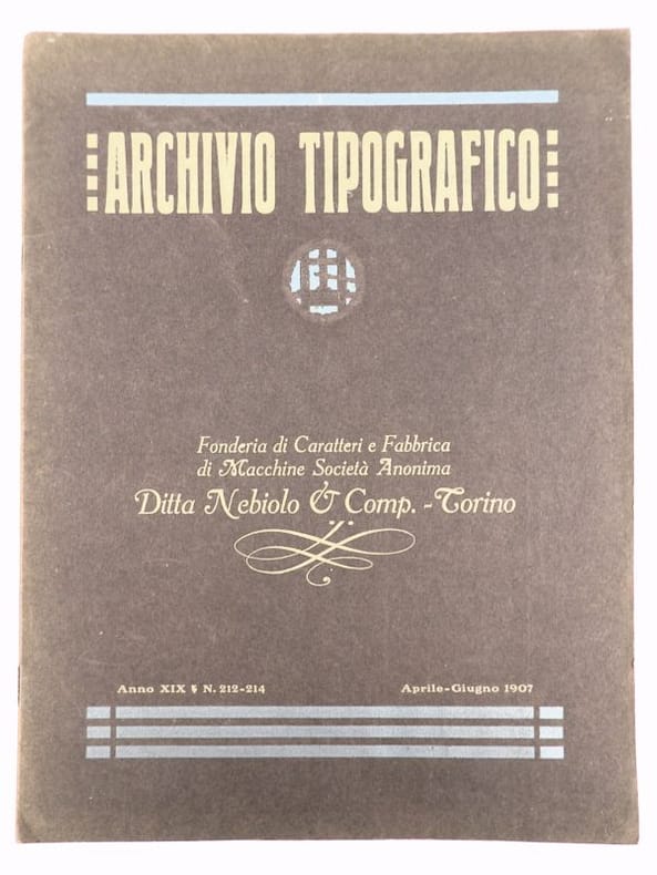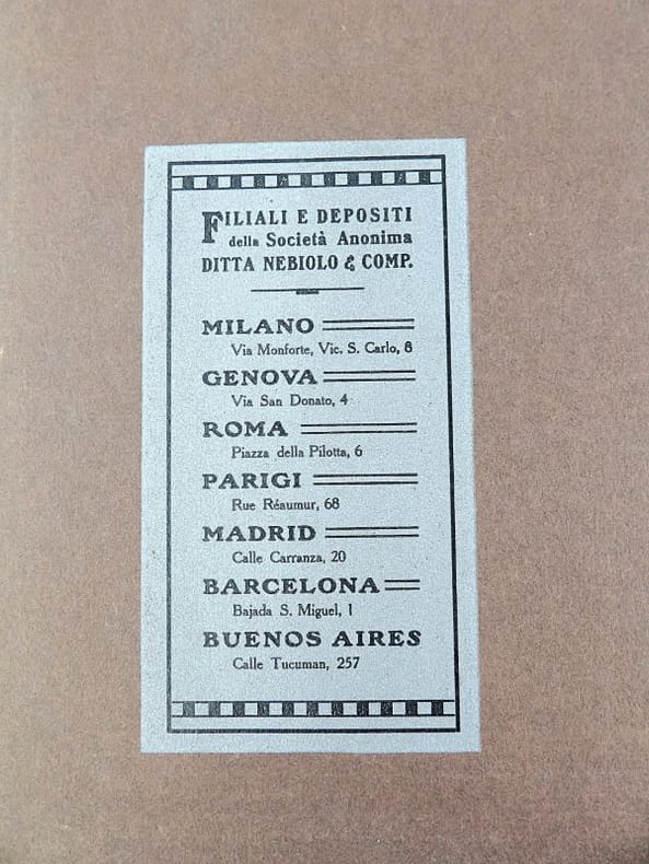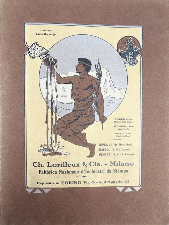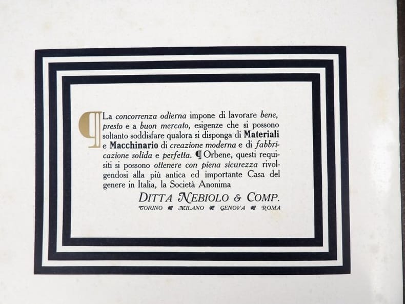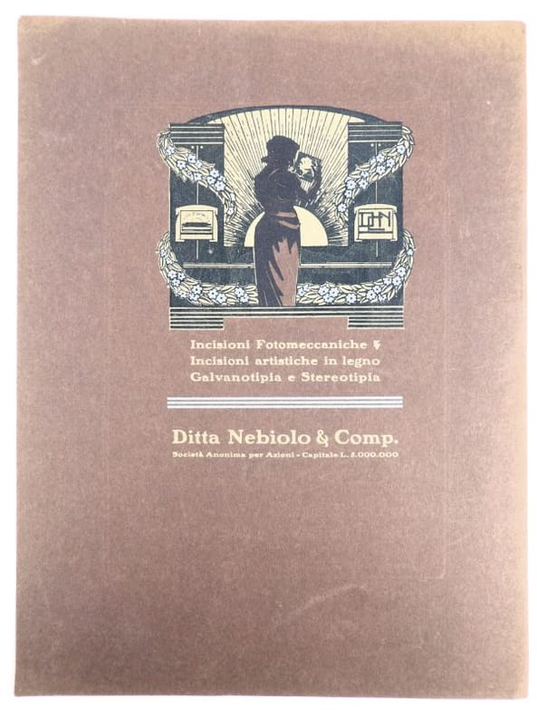 Turin (Italie), Nebiolo, 1907. 31,5 x 24 cm. Broché, couvertures illustrées et titrées. 20 Pages. Belle impression Art Nouveau. Plaquette bilingue en français et en italien.