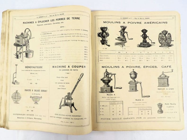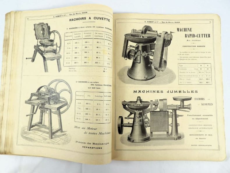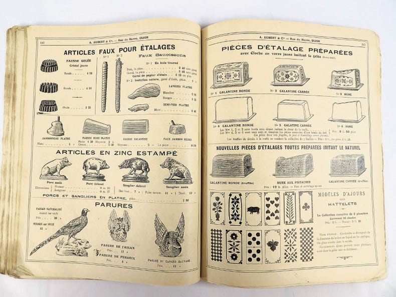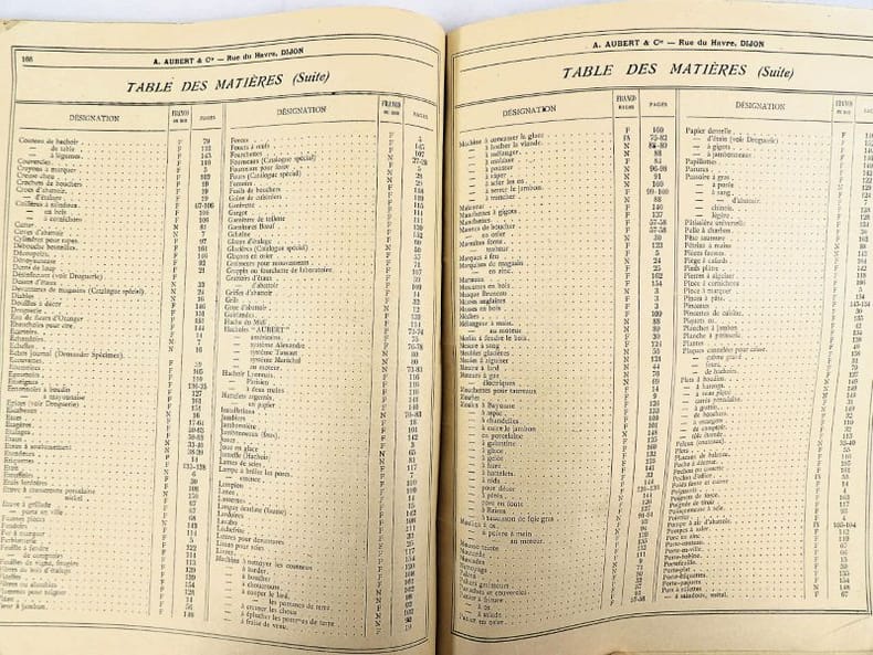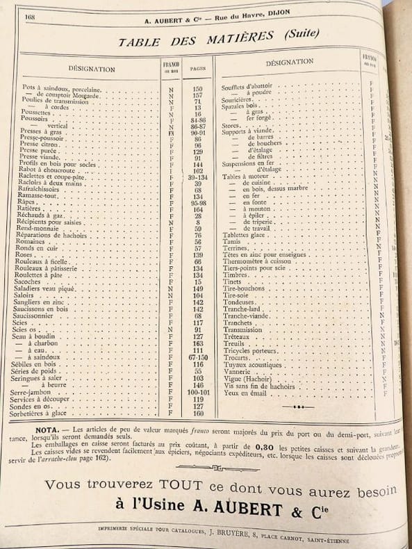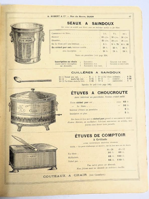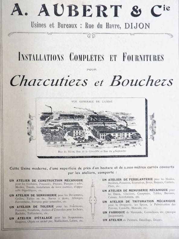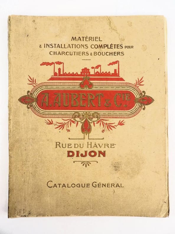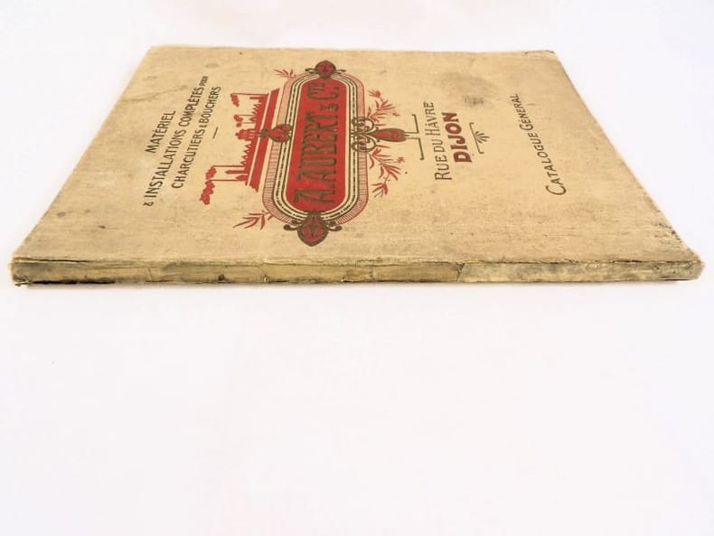 Dijon, Aubert & Cie (imprimerie Bruyere), sans date (circa 1910). 27 x 21,5 cm. Broché, premier plat de couverture titré. 166 pages paginées (sur 168). Très riche catalogue, abondamment illustré, extrêmement complet sur le sujet allant du matériel pour abattoirs, jusqu'aux pots de moutarde fantaisie en passant par les devantures de magasins, les fourneaux, le mobilier, les ustensiles, moules, machines, étiquettes et présentoirs, moulins à poivre, etc. Un feuillet manquant : pages 151/152 qui, d'après la table des matières, contenaient droguerie, eau de fleur d'oranger, épices, gélatine, muscades et papier d'étain.
