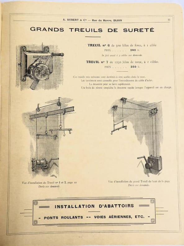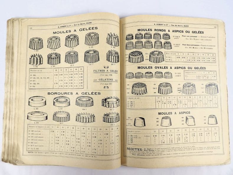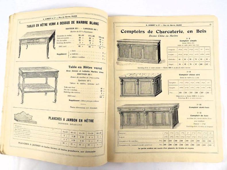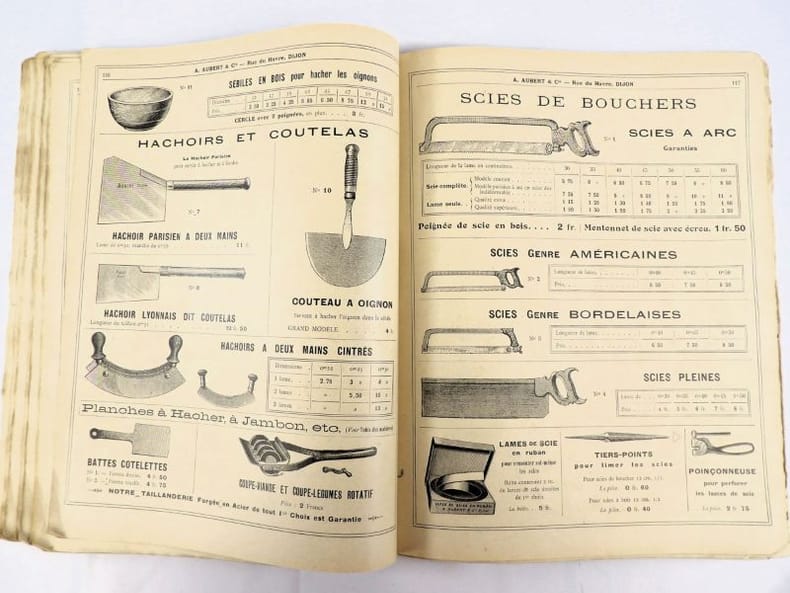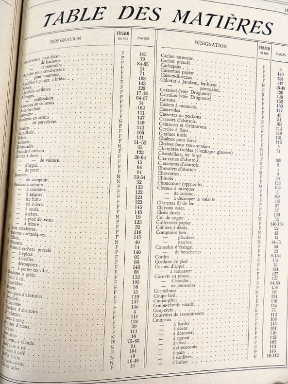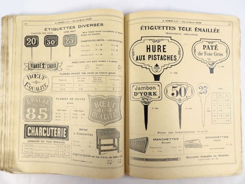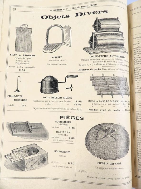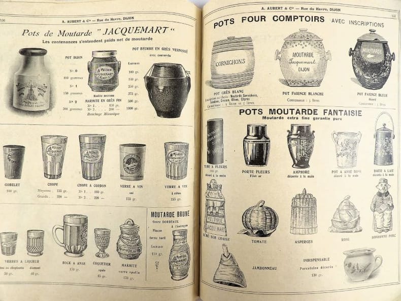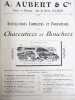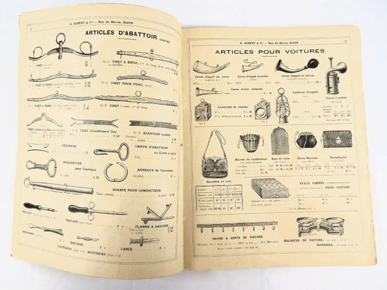 Dijon, Aubert & Cie (imprimerie Bruyere), sans date (circa 1910). 27 x 21,5 cm. Broché, premier plat de couverture titré. 166 pages paginées (sur 168). Très riche catalogue, abondamment illustré, extrêmement complet sur le sujet allant du matériel pour abattoirs, jusqu'aux pots de moutarde fantaisie en passant par les devantures de magasins, les fourneaux, le mobilier, les ustensiles, moules, machines, étiquettes et présentoirs, moulins à poivre, etc. Un feuillet manquant : pages 151/152 qui, d'après la table des matières, contenaient droguerie, eau de fleur d'oranger, épices, gélatine, muscades et papier d'étain.
