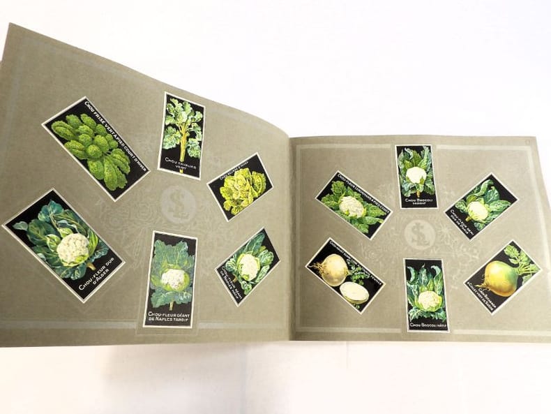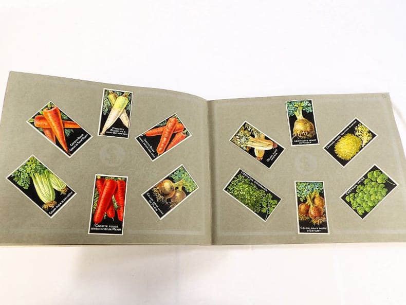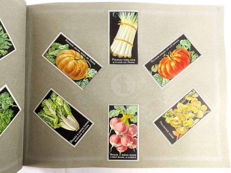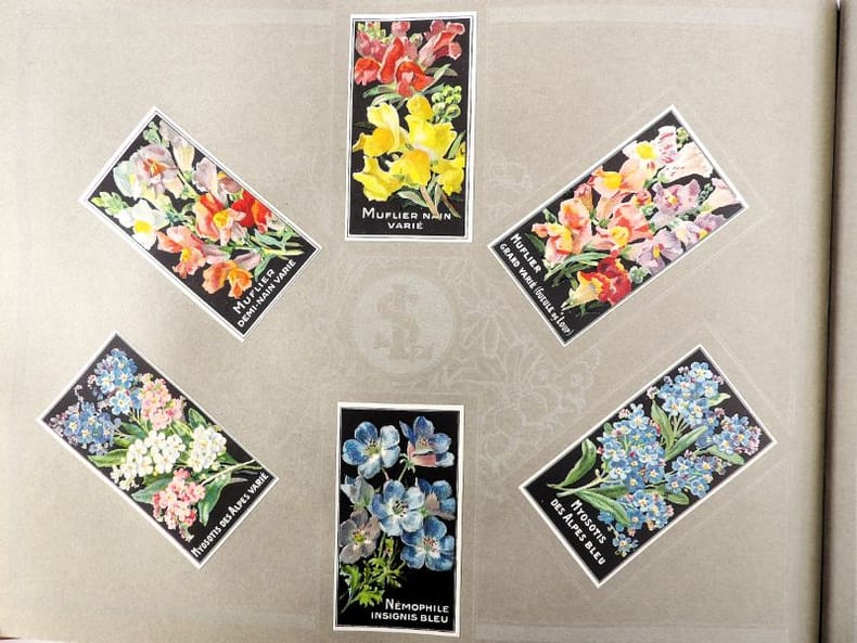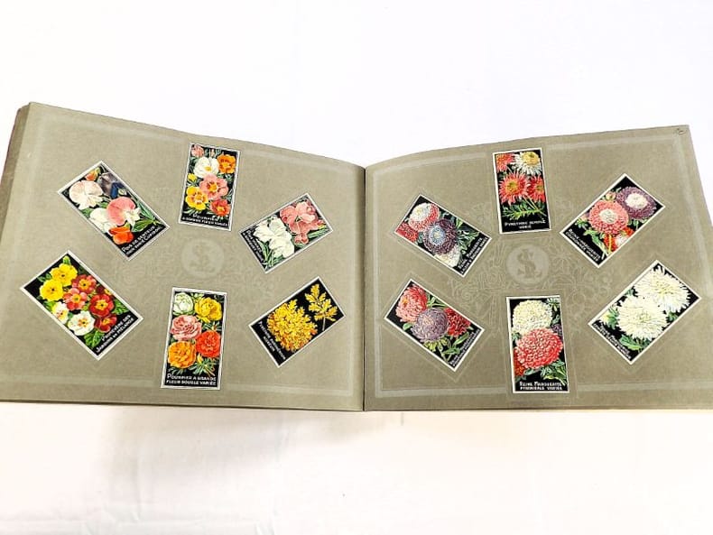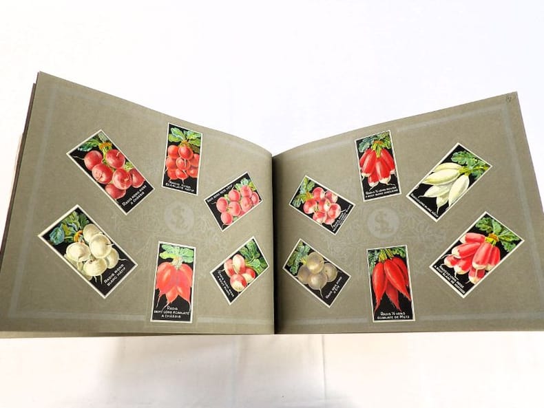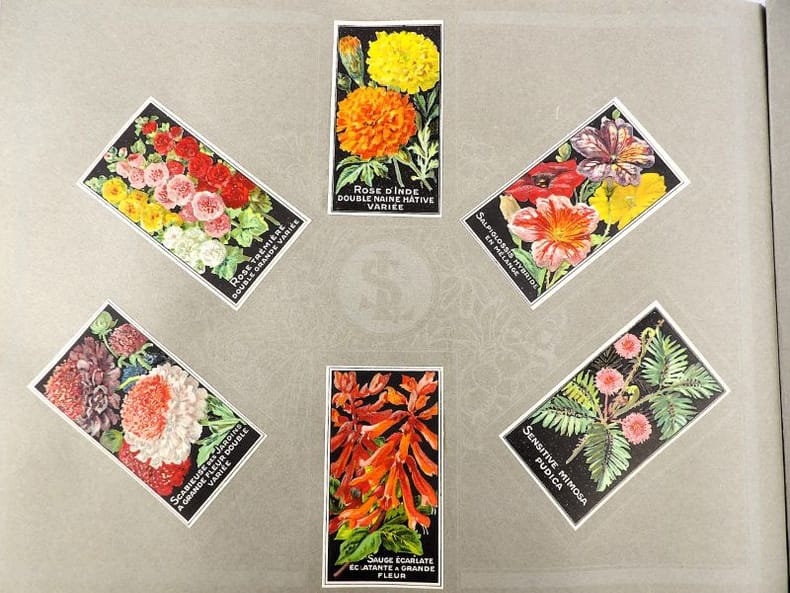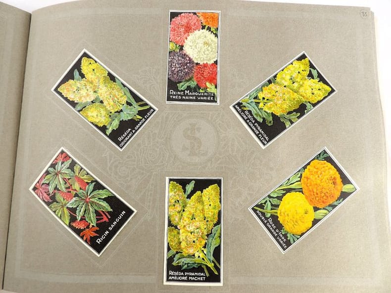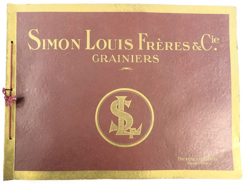 Bruyères-le-Châtel, Simon Louis Frères et Cie, sans date [circa 1930]. Format oblong, 36 x 27 cm. En feuilles de papier fort, reliées par une fine cordelette torsadée sous une couverture portant sur le premier plat le nom complet, le chiffre et la localisation de l'entreprise inscrits en doré sur fond bordeaux. 36 feuillets. Rare et important catalogue orné de 406 chromolithographies (9 x 5 cm) présentant de nombreuses variétés de semences pour l'horticulture, classées par catégories et par ordre alphabétique : légumes, fruits (tomates uniquement) et fleurs. Ces échantillons d'étiquettes de sachets de graines, aux couleurs très vives sur fond noir, sont artistiquement disposés en étoiles sur les pages de papier fort, imprimées en gris clair de cadres servant au placement des vignettes et, au centre, d'une composition florale ornant le monogramme de l'entreprise. A raison de 6 par page en moyenne, - exceptionnellement 4 ou 5 -, les images sont chacune scrupuleusement légendées en caractères blancs. Ce superbe album, aussi instructif pour le maraîcher professionnel que pour le jardinier du dimanche, propose une diversité considérable de plantes, issues des terroirs français, parfois bien oubliées aujourd'hui : pas moins de 10 sortes de chicorées, 11 de carottes, 27 de choux, 23 de laitue, 14 de navets, 19 de radis, sont ainsi présentées. La partie consacrée aux fleurs s'avère majoritaire en termes d'illustrations : 206 chromos, de l'acrolinium varié au zinnia du Mexique hybride, offrent à l'oeil du client, par leur mise en scène et leurs couleurs éclatantes, la perspective d'un rendu magnifique, qui ne peut qu'inciter à l'achat !