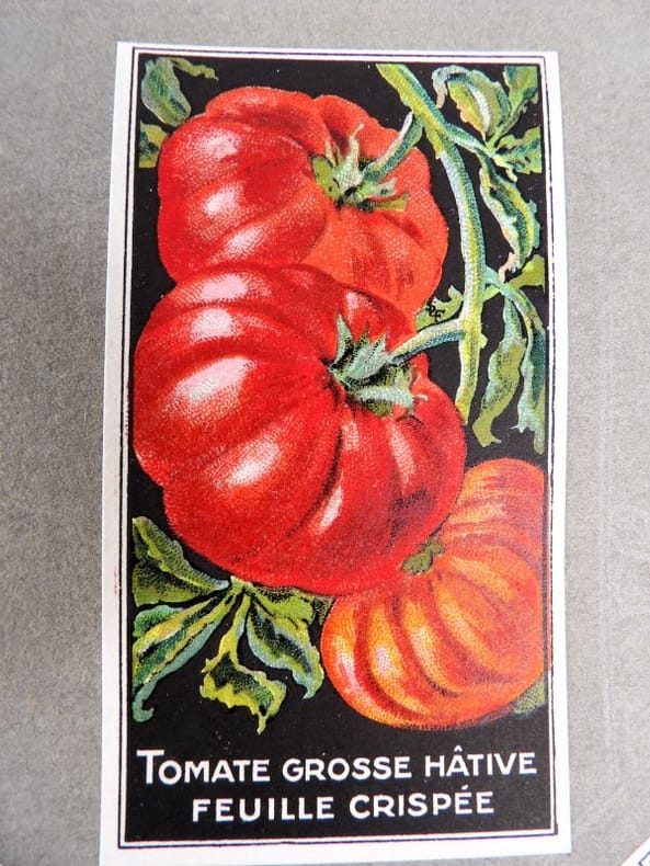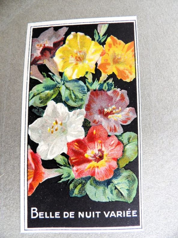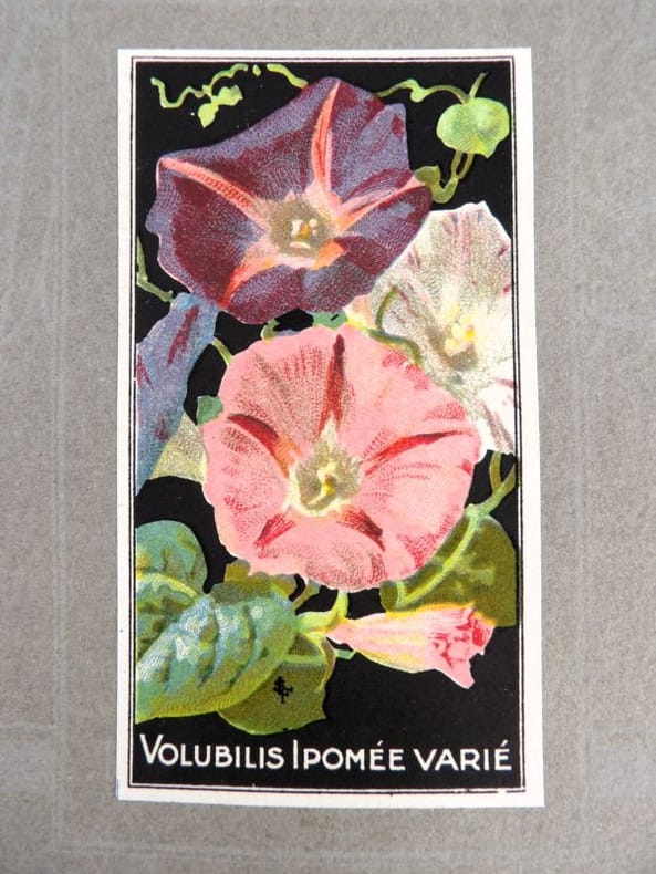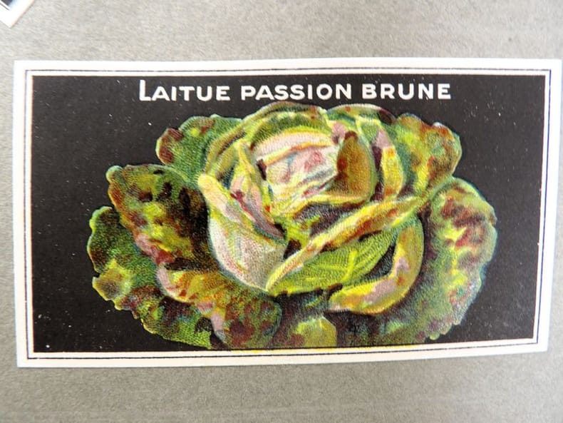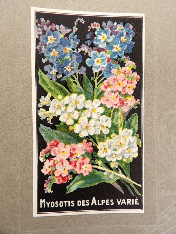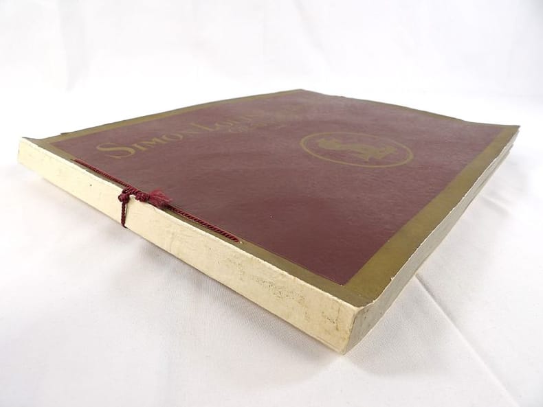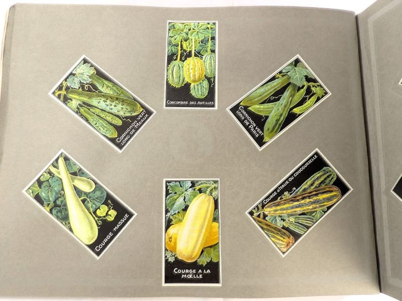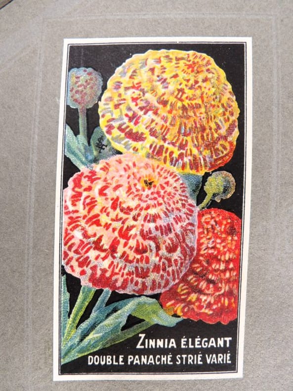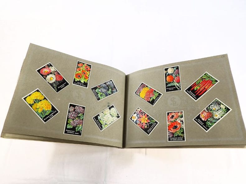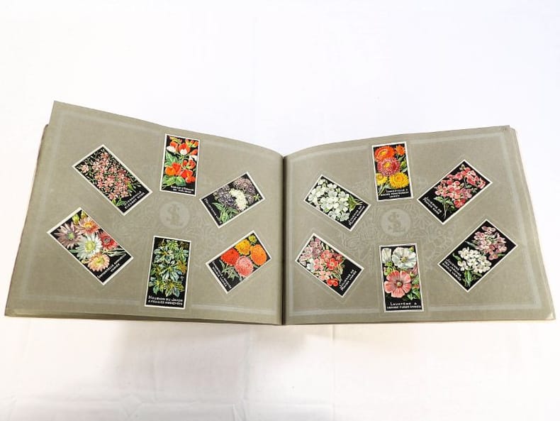 Bruyères-le-Châtel, Simon Louis Frères et Cie, sans date [circa 1930]. Format oblong, 36 x 27 cm. En feuilles de papier fort, reliées par une fine cordelette torsadée sous une couverture portant sur le premier plat le nom complet, le chiffre et la localisation de l'entreprise inscrits en doré sur fond bordeaux. 36 feuillets. Rare et important catalogue orné de 406 chromolithographies (9 x 5 cm) présentant de nombreuses variétés de semences pour l'horticulture, classées par catégories et par ordre alphabétique : légumes, fruits (tomates uniquement) et fleurs. Ces échantillons d'étiquettes de sachets de graines, aux couleurs très vives sur fond noir, sont artistiquement disposés en étoiles sur les pages de papier fort, imprimées en gris clair de cadres servant au placement des vignettes et, au centre, d'une composition florale ornant le monogramme de l'entreprise. A raison de 6 par page en moyenne, - exceptionnellement 4 ou 5 -, les images sont chacune scrupuleusement légendées en caractères blancs. Ce superbe album, aussi instructif pour le maraîcher professionnel que pour le jardinier du dimanche, propose une diversité considérable de plantes, issues des terroirs français, parfois bien oubliées aujourd'hui : pas moins de 10 sortes de chicorées, 11 de carottes, 27 de choux, 23 de laitue, 14 de navets, 19 de radis, sont ainsi présentées. La partie consacrée aux fleurs s'avère majoritaire en termes d'illustrations : 206 chromos, de l'acrolinium varié au zinnia du Mexique hybride, offrent à l'oeil du client, par leur mise en scène et leurs couleurs éclatantes, la perspective d'un rendu magnifique, qui ne peut qu'inciter à l'achat !