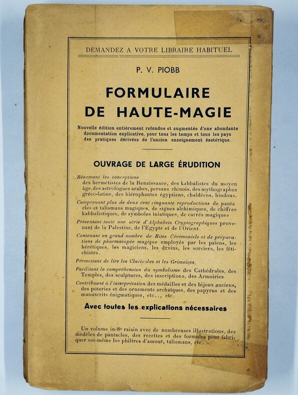 Editions Dangles 1936. In-8 broché de 318 pages au format 22,5 x 3,5 x 14,5 cm. Couverture avec titre imprimé. Dos carré, légèrement insolé, avec minuscules pliures de lecture. Plats et intérieur assez frais. Etude la Magie et l'Occultisme avec illustrations en noir in et hors texte. Sommaire : L'Homme en rapport avec les énergies secrètes de l'Univers - Les phénomènes Occultes et leur déterminisme - L'Ascèse Magique - Rituel de Magie - Talismans - Envoûtements - Evocations - Perception de l'Invisible - Clé des Grands Mystères - La Mort et l'Au-Delà. Mention de 12ème mille. Bel état général. Edition remaniée et considérablement augmentée, en partie originale. Complet de la carte postale éditeur et du questionnaire réservé aux lecteurs.