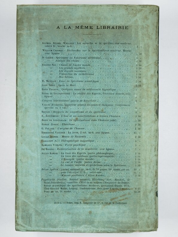 1946 un volume, broché bleu grand in-octavo Editeur (paperback in-8 editor) (14,6 x 22,6 cm), dos et couverture imprimés en noir, toutes tranches lnon rognées, orné d'un portrait gravé de l'auteur en noir + 10 planches in-fine (les planches manquent), XXXII + 635 pages, 1906 Paris Librairie des Sciences Psychiques Editeur,