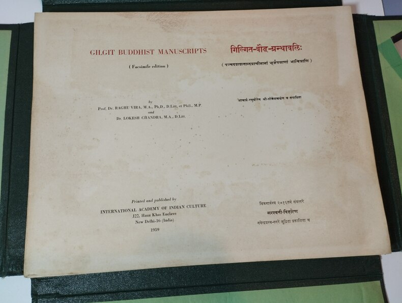 New Delhi, international academy of indian culture, 1959 (1), 1960 (2), 1966 (3,4), 1970 (5), 1974 (6-10). 10 vol. in-folio, vol 1-5 : 51 ; 44 ; 44 ; 44 ; 117 ff. volants ; Vol 6-10, 103, 99, 99, 101, 90 ff., Intérieurs frais (qqs. rares très rouss, déchirure marginale sans atteinte au texte sur 1 f. du vol. 7, brunissure sur les pp. de titre des vol. 1-5). vol. 1-5 sous coffrets cartonnés à rabats pleine percaline verte, titrés aux plats sup. sur étiquettes de papier avec dos muets pour les vol. 1 et 2, titrés dorés aux dos et plats sup. pour les vol. 3 à 5 ; vol. 6-10 reliés de même pleine percaline verte, tités dorés aux dos et plats sup. (lacets de fermeture manquant aux vol 1 et 2, déch. marginale sans atteinte au texte sur l'étiquette de titre du vol. 1, fissures et 1 petit accros sur les rabats lat. des vol. 1-4, reliures et coffrets lég. frottés). Bon état général sinon.