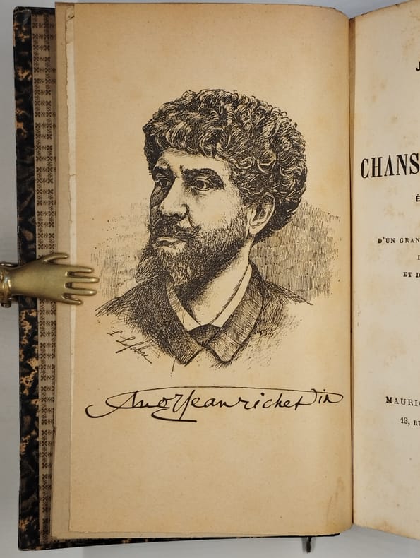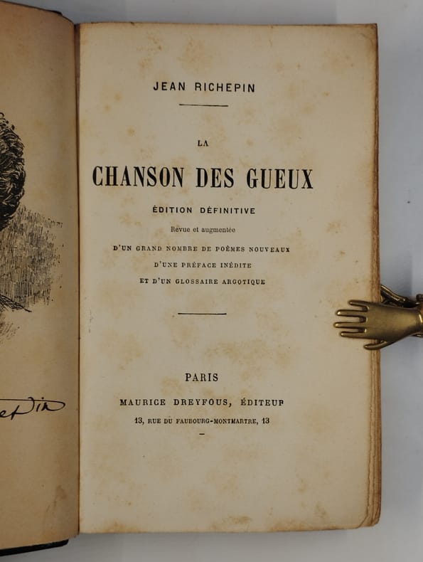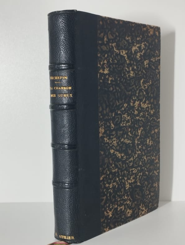 On a relié dans notre exemplaire, Richepin jean. la Chanson des Gueux. Pièces supprimées. Bruxelles, Henri Kistemaeckers, 1881; petit in-12 de 22pp. (1)f.; couverture beige imprimée en noir conservée. Dans sa préface à cette édition des pièces supprimées, Jean Richepin rend hommage au libraire belge pour les avoir publiées et en revendique fort la paternité contre la pudibonderie et cruauté mutilatrice de la Justice française. ( Cf. Vicaire VI - 1112) Rares rousseurs, fentes aux mors.( Reu-Bur)