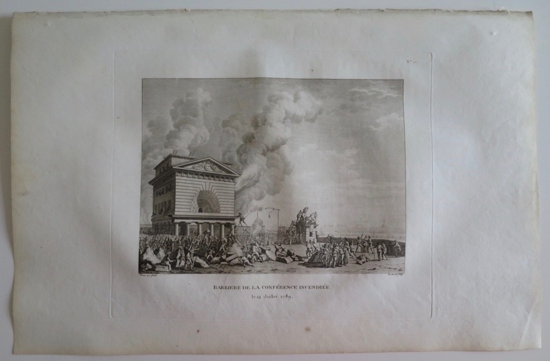 Gravure de format d'environ 31/47 cm (pour la planche), 19,5 / 26 cm (pour la gravure elle-même), représentant N°10) Barrière de la conférence incendiée, le 12 Juillet 1789. Cette gravure est issue d'un des premiers livres d'images consacrés à la Révolution française, qui connut plusieurs éditions entre 1791 et 1805, avec parfois des variations dues aux changements politiques. Envoi Colissimo. Frais d'envoi 7 euros sur la France, 15,05 UE et Suisse, entre 19,60 et 26,70 euros pour le reste du monde, à spécifier selon zone. Possibilité de remise en mains propres sur Paris, possibilité d envoi MONDIAL RELAY, n'hésitez pas à me contacter avant de passer commande. Twitter : @Pontneuf06.